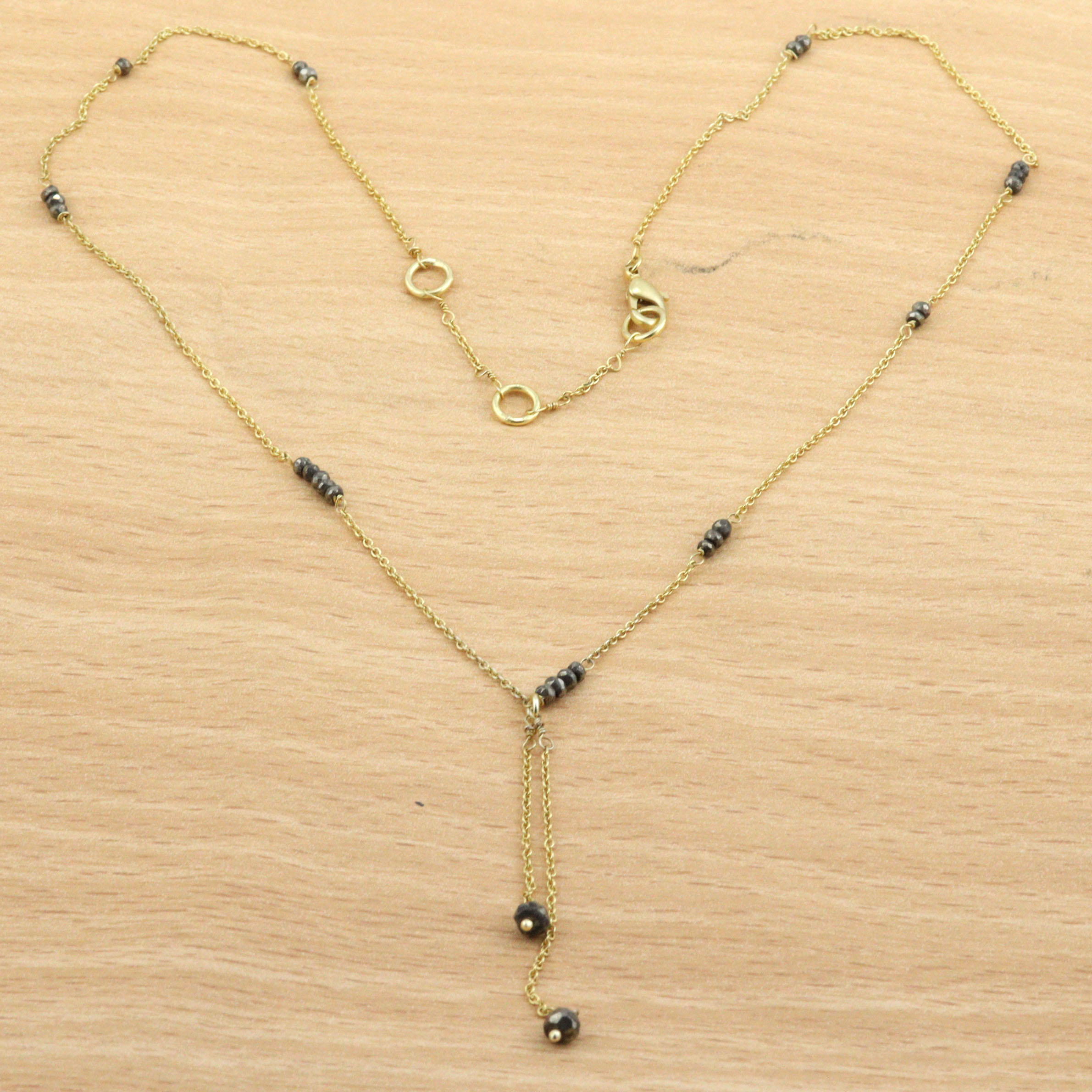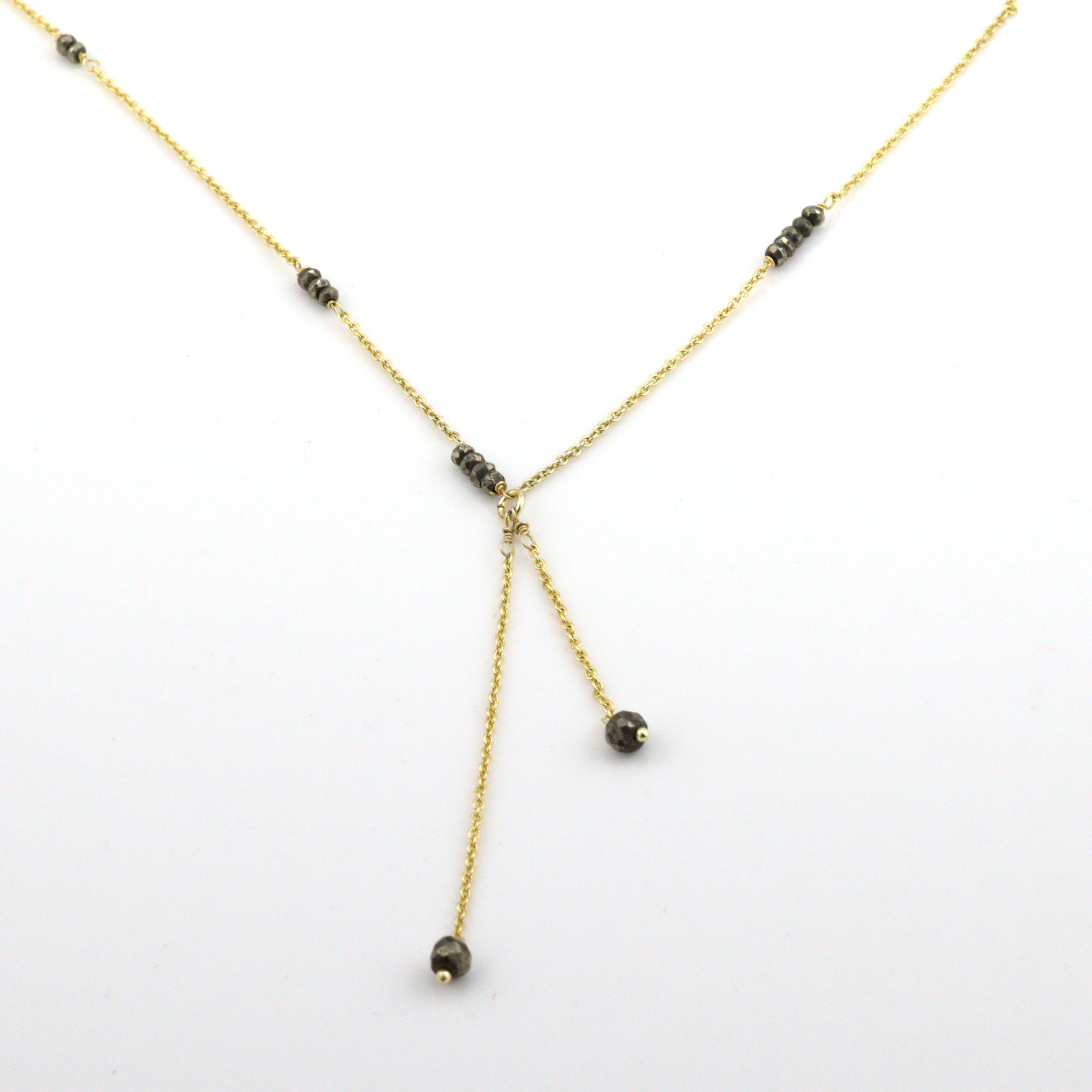 Wipe the beads and chain gently after every wear to protect the pyrite’s shine and keep the gold plating looking bright.