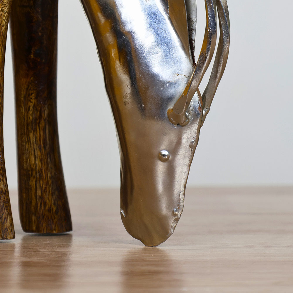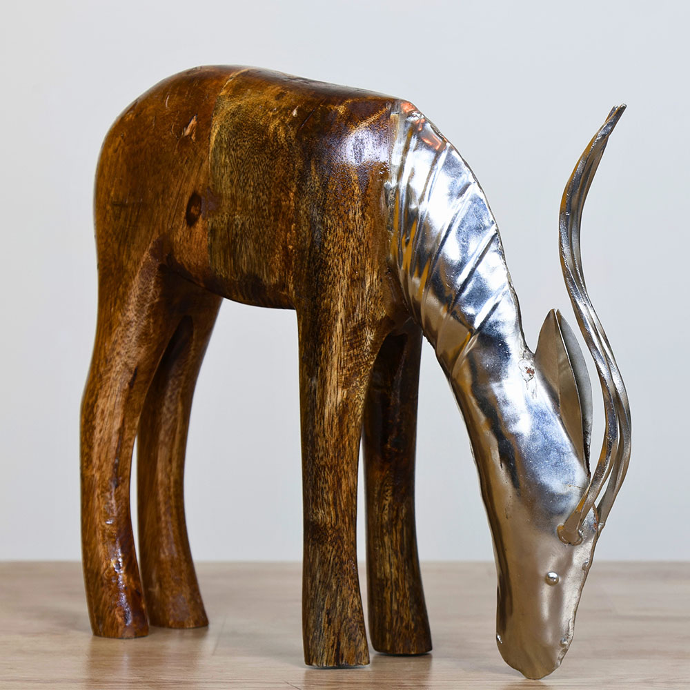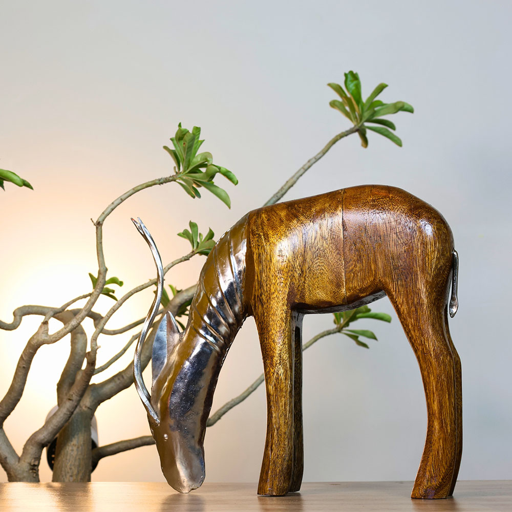 Hand-carved from solid wood and accented with metal, this deer sculpture channels a quiet woodland spirit. Its rustic textures and graceful stance stir nostalgia and invite mindfulness, transforming your home into a peaceful retreat that honours natures beauty.
