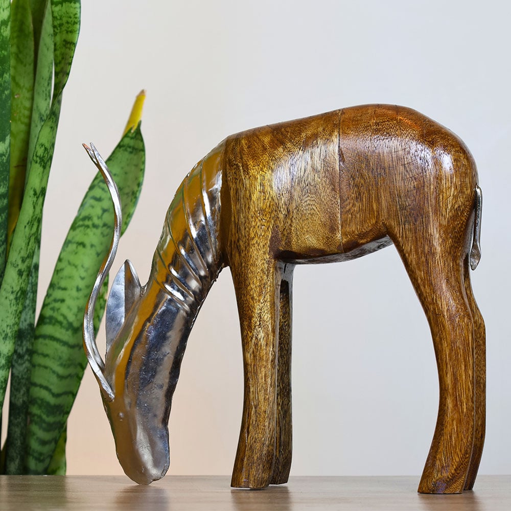 Channel rustic serenity with this natural wood deer sculpture, handcrafted from solid wood and adorned with polished metal details. Its wildlife-inspired design captures the essence of safari dcor, offering a calming presence for decorators, nature enthusiasts, and gift seekers who value organic textures and timeless silhouettes. Packed & quality-checked by Indianshelf.