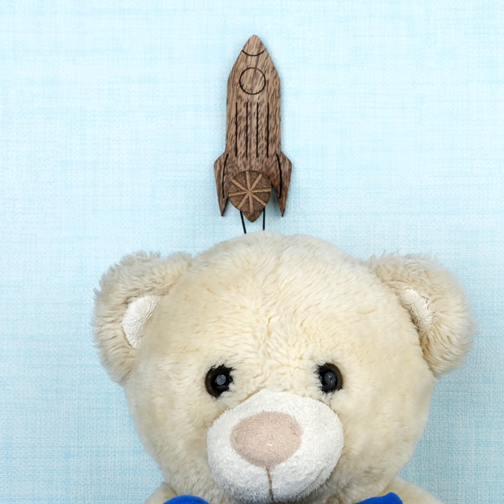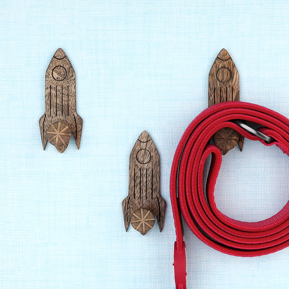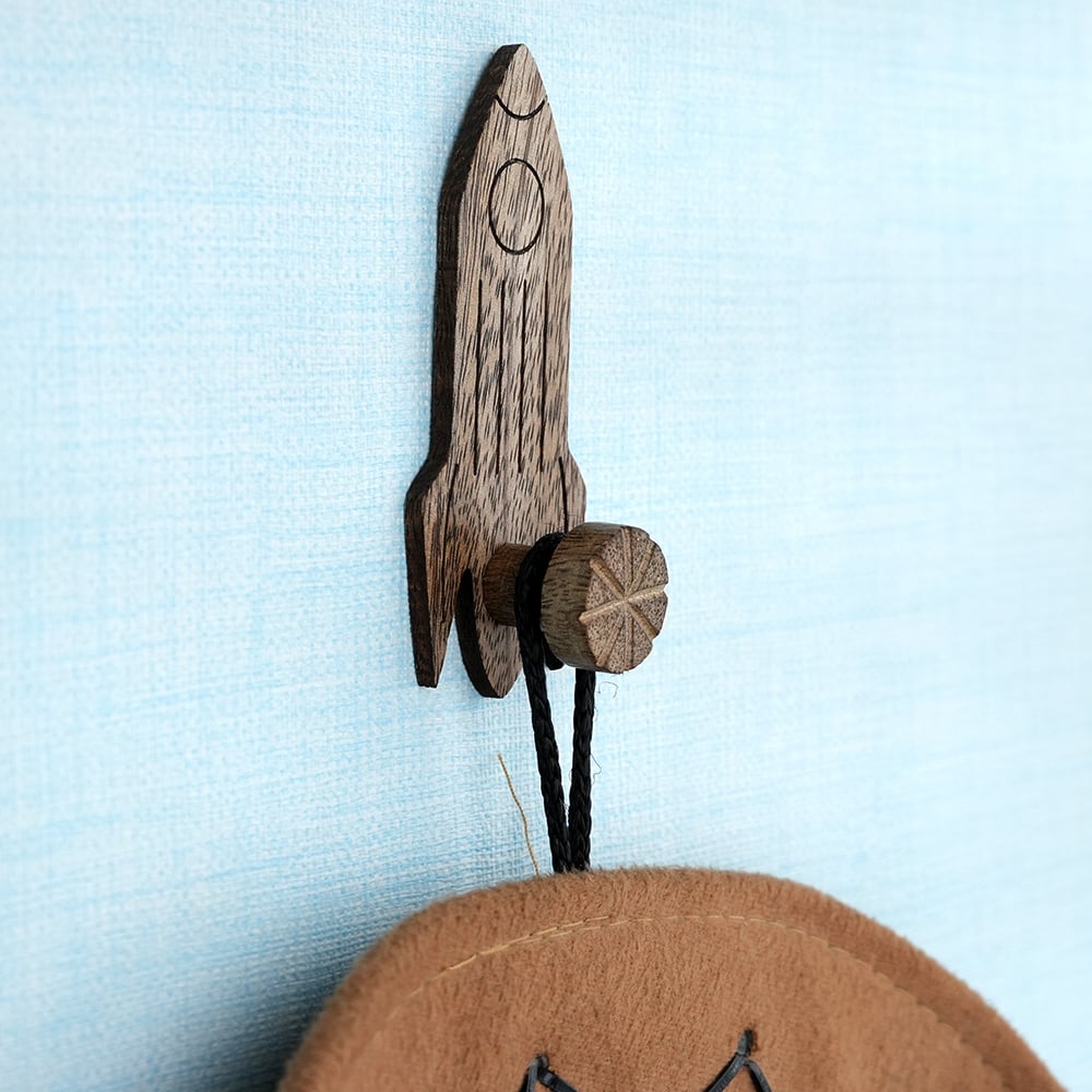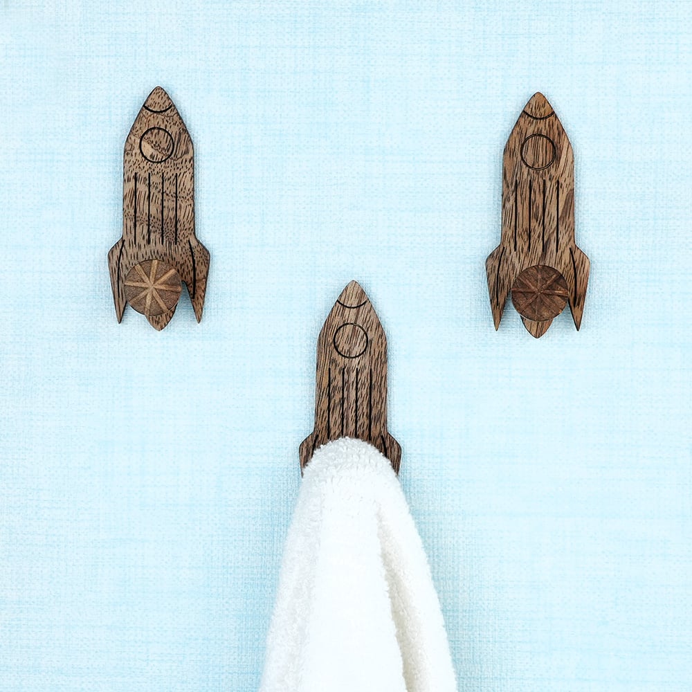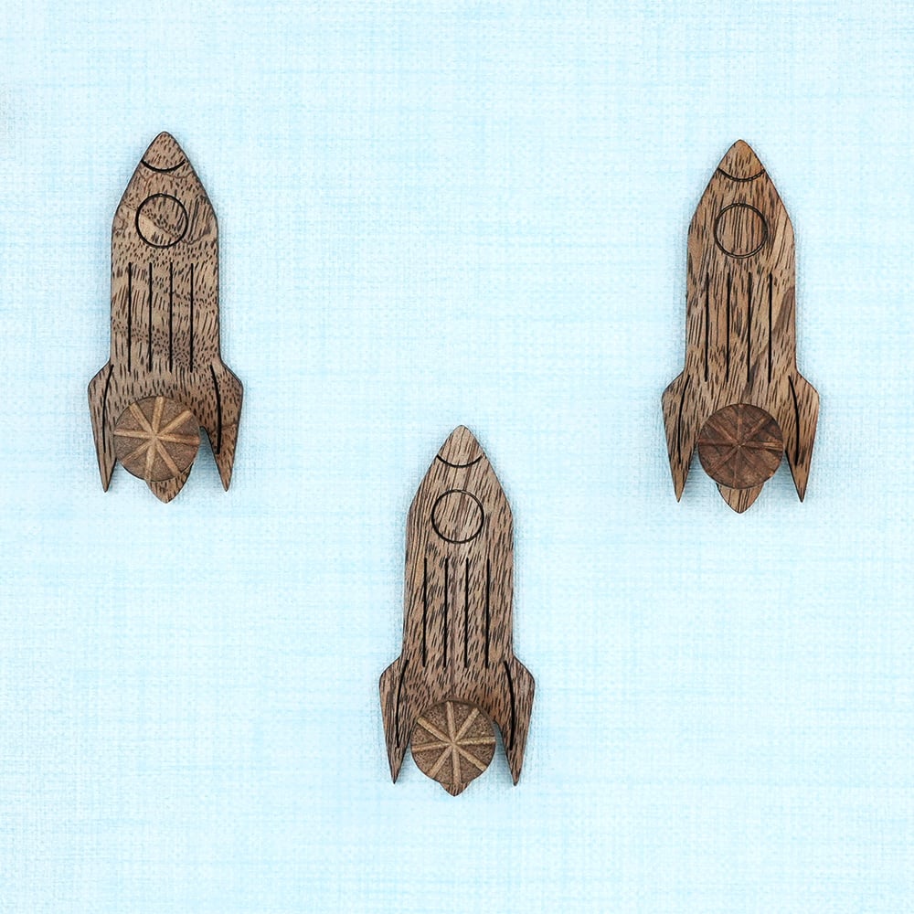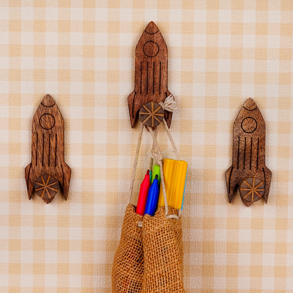 Natural Wooden Adhesive Rocket Shape Coat Wall Hook-Pack of 3