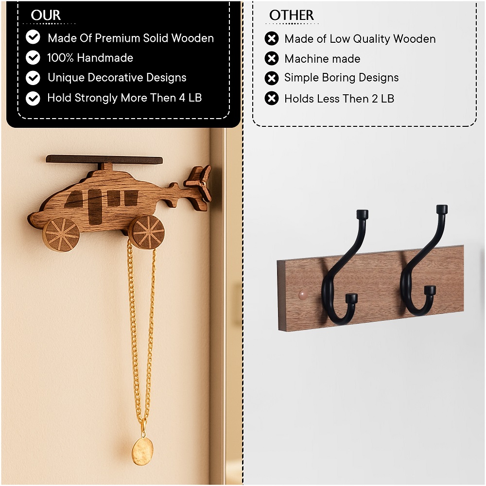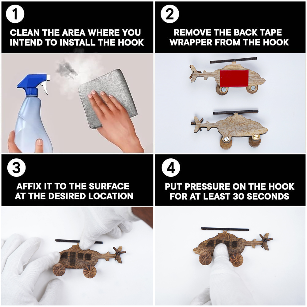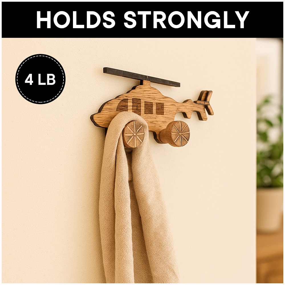 Add a fun and functional touch to your space with these wooden helicopter-shaped adhesive wall hooks. Crafted from high-quality natural wood, these hooks bring a unique blend of creativity and practicality to your home decor. The smooth finish and intricate detailing make them perfect for kids rooms, study areas, or any playful space. With a strong self-adhesive backing, theyre easy to install on any smooth surface no drilling required!