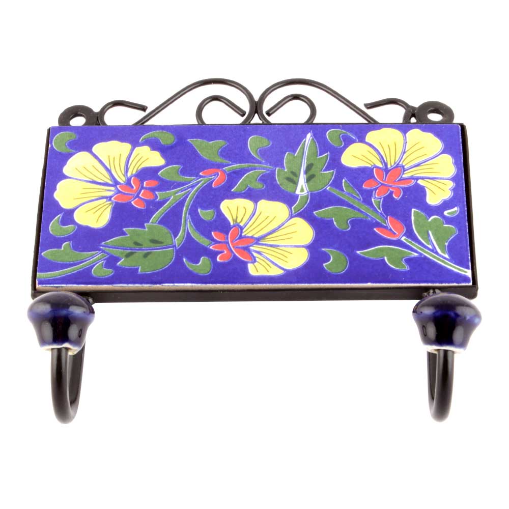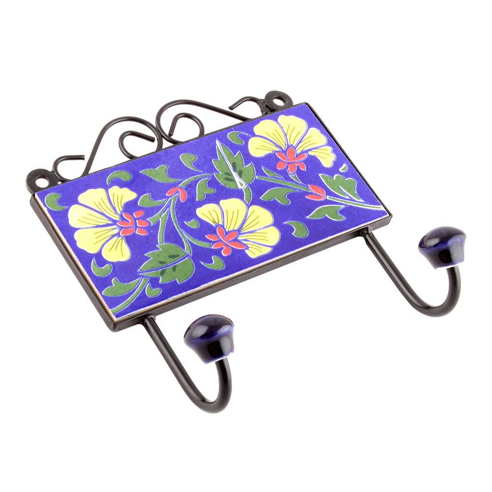 Navy Blue And Forest Green Leaf Ceramic Floral Tiles Hooks. When Put on Wall or Cabinet it is an Art in itself. The Metal Part of this Hook is Black Powder Coated.
