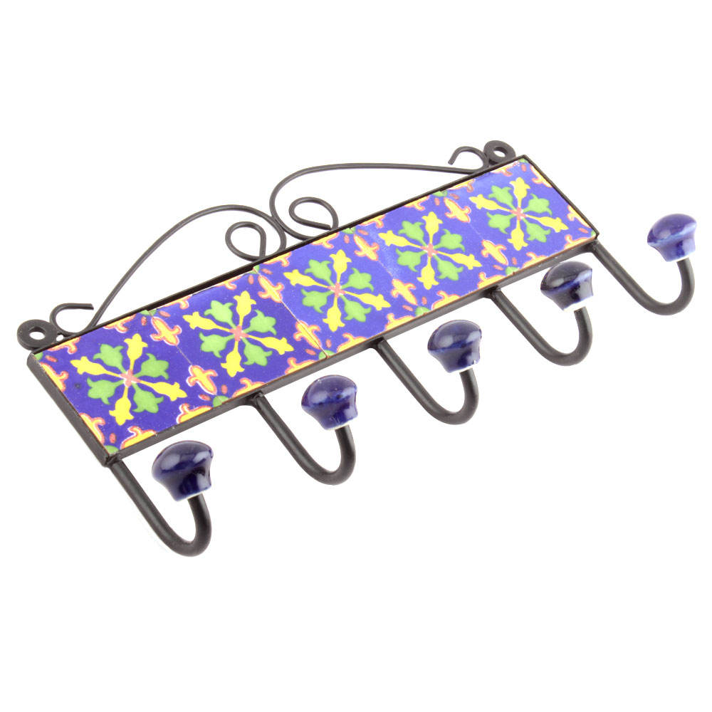 Navy Blue And Green Floral Tiles Hooks. When Put on Wall or Cabinet it is an Art in itself. The Metal Part of this Hook is Black Powder Coated.