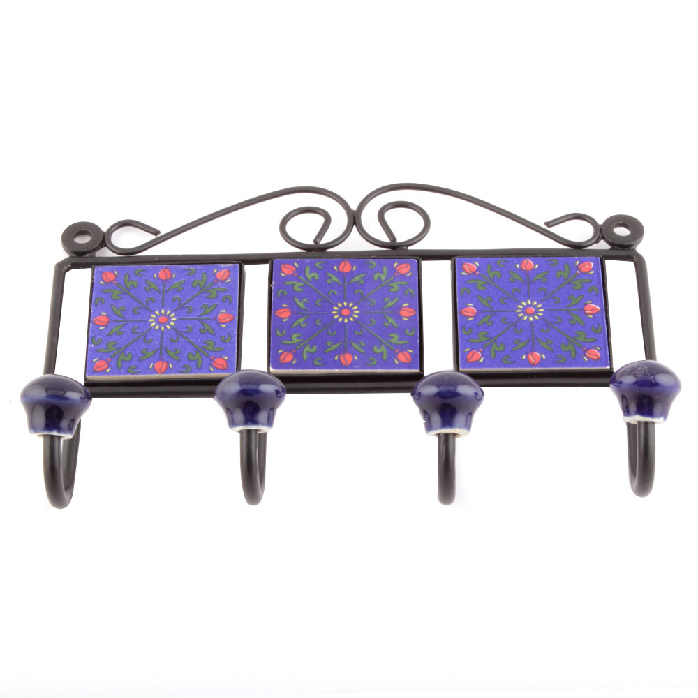 Navy Blue And Red Rose Flower Tiles Hooks. When Put on Wall or Cabinet it is an Art in itself. The Metal Part of this Hook is Black Powder Coated.