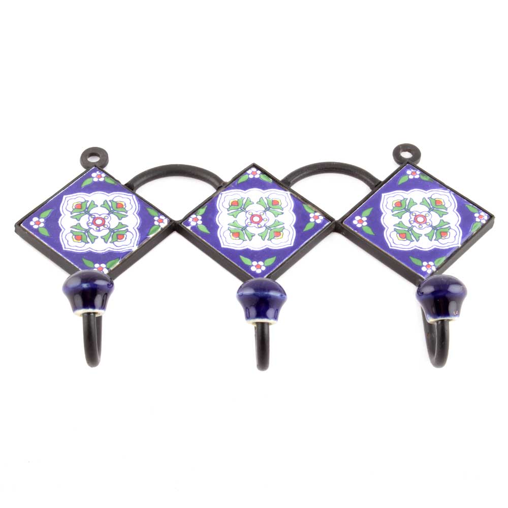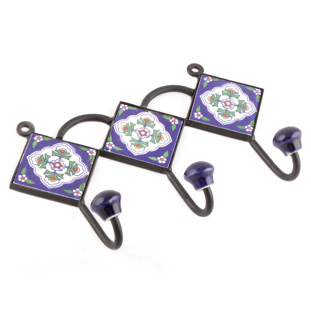 Navy Blue And White Ceramic Floral Tiles Hooks. When Put on Wall or Cabinet It is An Art in Itself. The Metal Part of this Hook is Black Powder Coated.