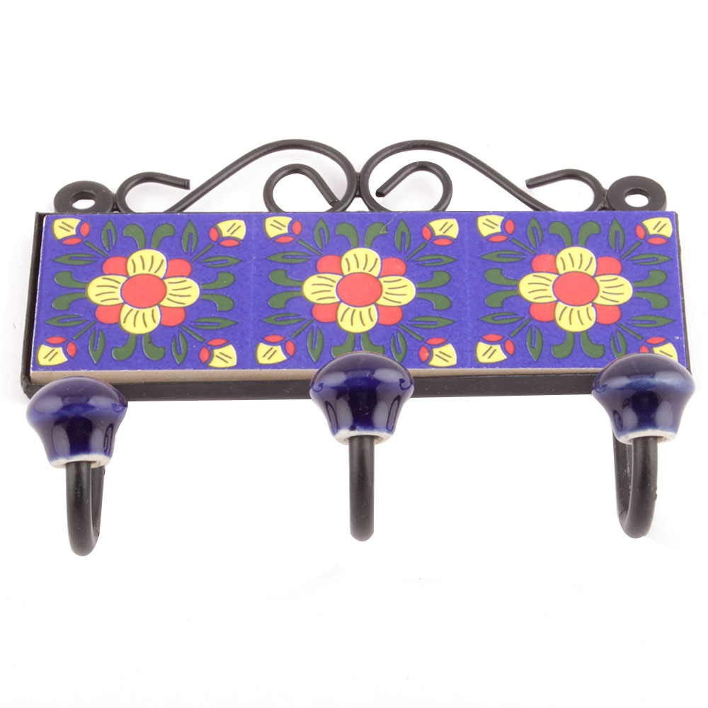 Navy Blue And Yellow Floral Tiles Hooks. When Put on Wall or Cabinet it is an Art in itself. The Metal Part of this Hook is Black Powder Coated.