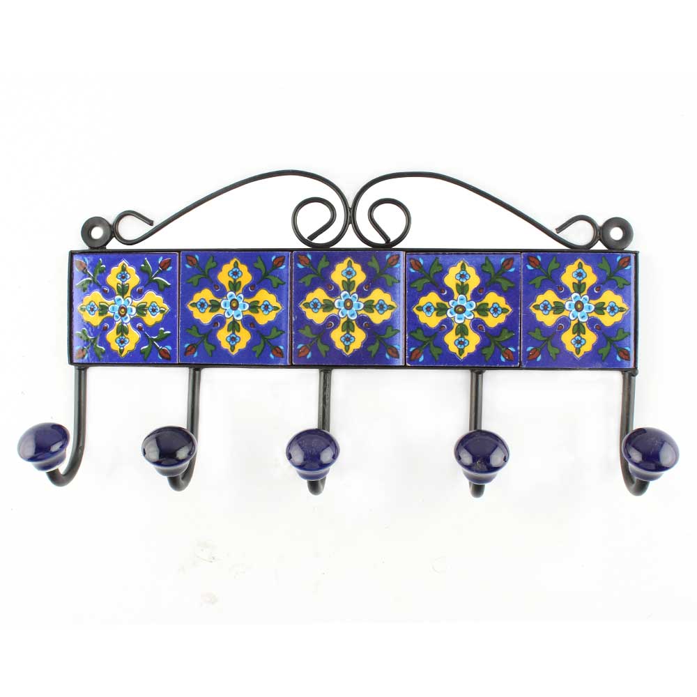 Navy Blue And Yellow Flower Ceramic Tiles Hook. When Put on Wall or Cabinet It is An Art in Itself. The Metal Part of this Hook is Black Powder Coated.