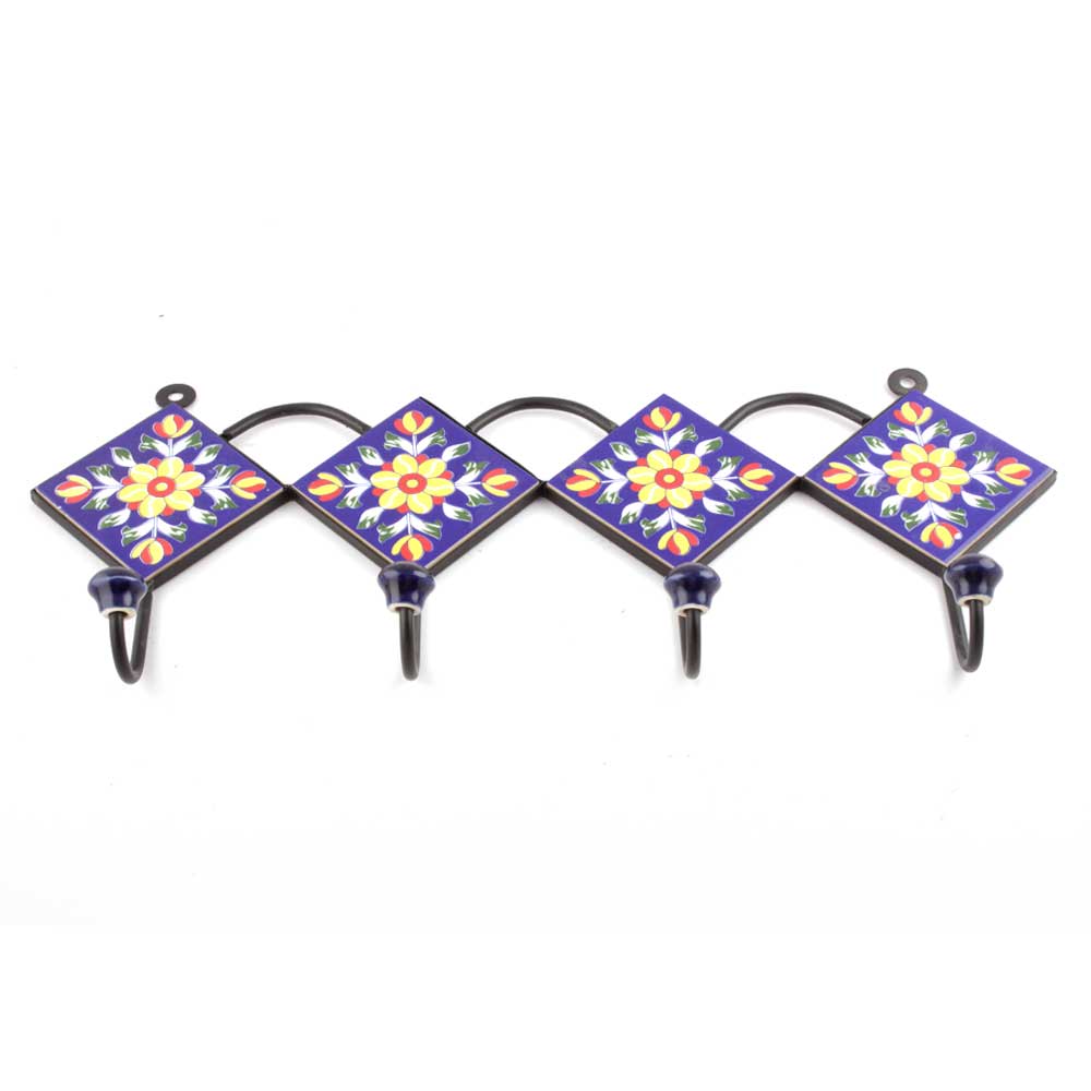 Navy Blue And Yellow Tiny Flower Ceramic Tiles Hooks. When Put on Wall or Cabinet It is An Art in Itself. The Metal Part of this Hook is Black Powder Coated.