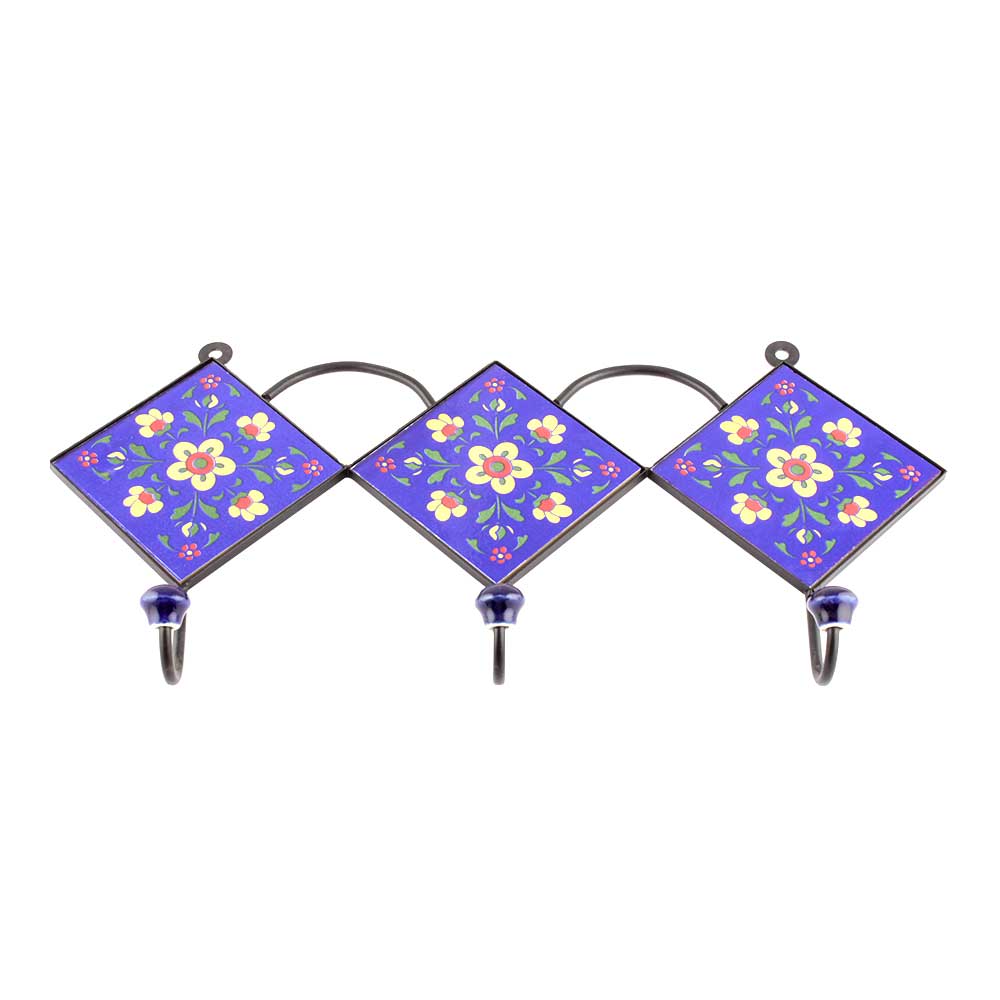 Navy Blue And Yellow Tiny Flower Ceramic Tiles Hooks Online. When Put on Wall or Cabinet it is an Art in itself. The Metal Part of this Hook is Black Powder Coated.