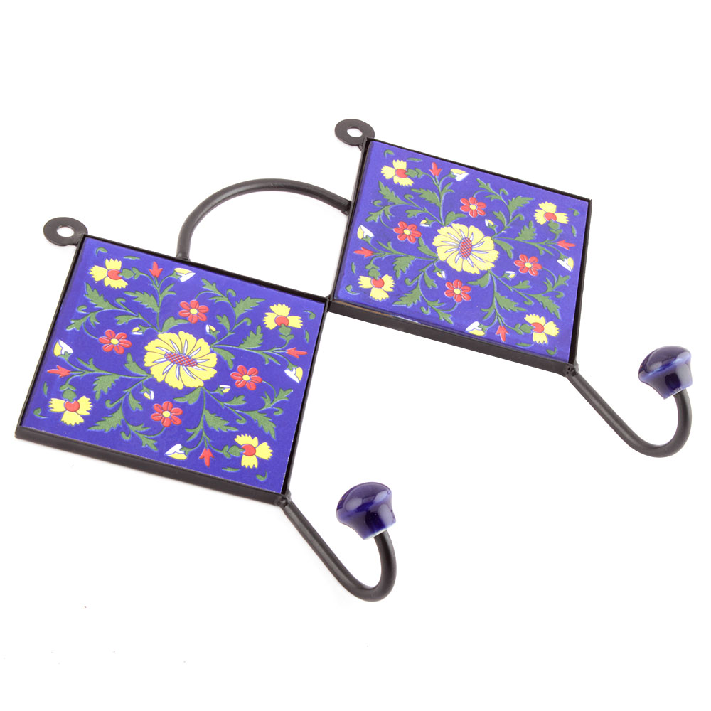 Navy Blue And Yellow Wheel Flower Ceramic Tiles Hooks. When Put on Wall or Cabinet it is an Art in itself. The Metal Part of this Hook is Black Powder Coated.