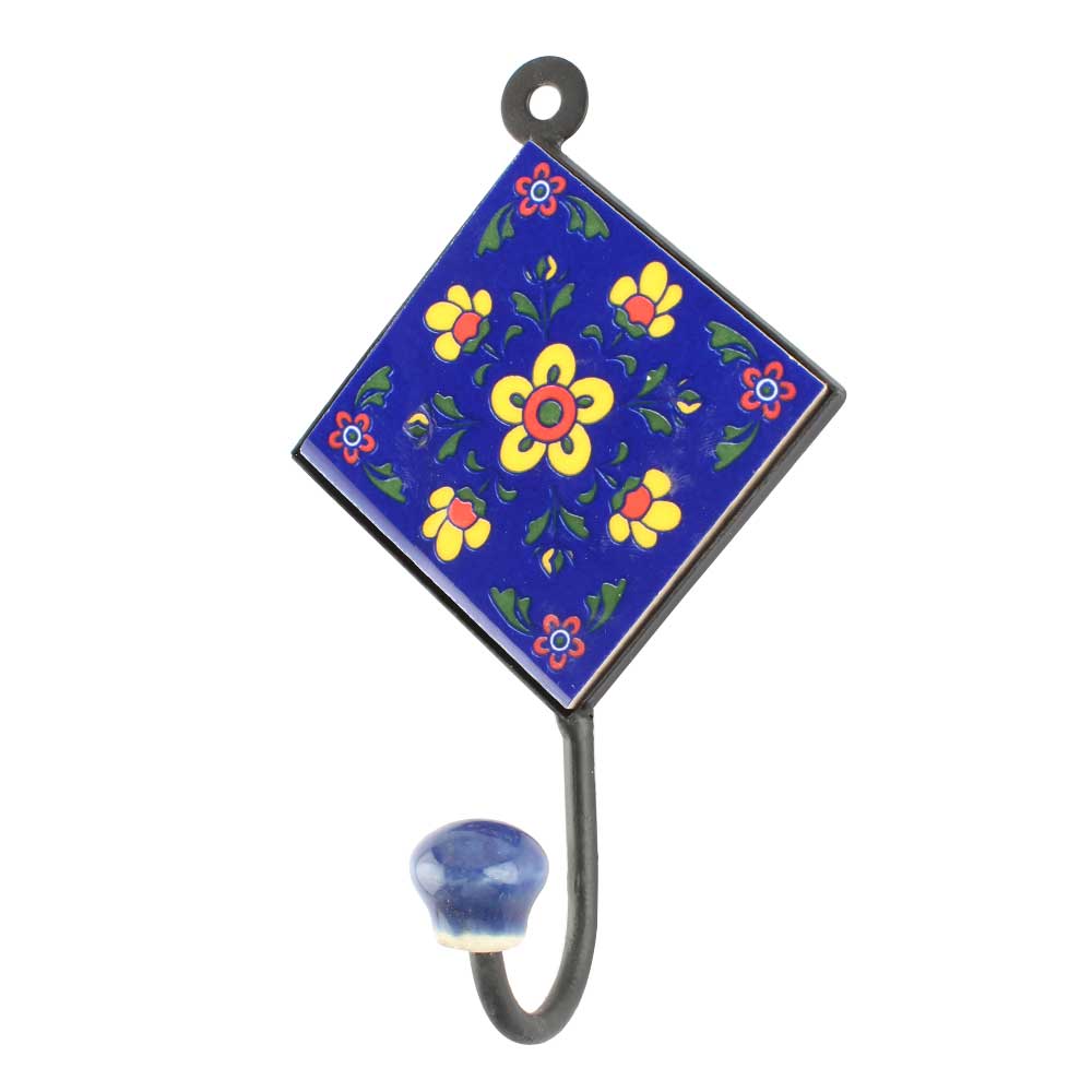 Navy Blue Ceramic Floral Tiles Hooks Online. When Put on Wall or Cabinet It is An Art in Itself. The Metal Part of this Hook is Black Powder Coated.