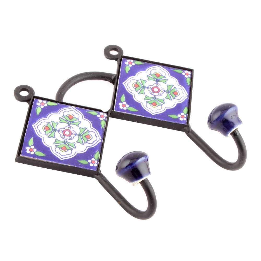 Navy Blue Floral Tiles Hooks. When Put on Wall or Cabinet it is an Art in itself. The Metal Part of this Hook is Black Powder Coated.