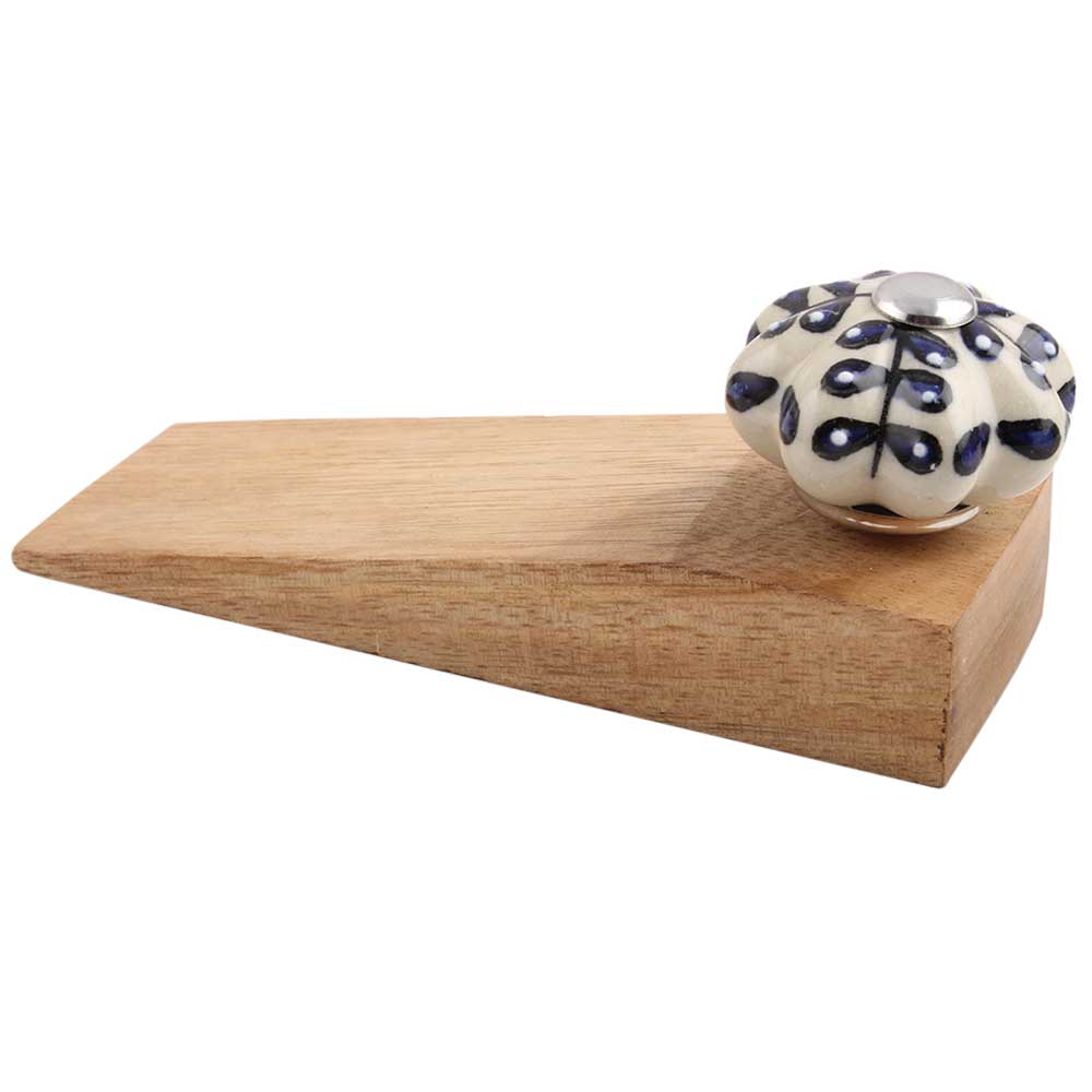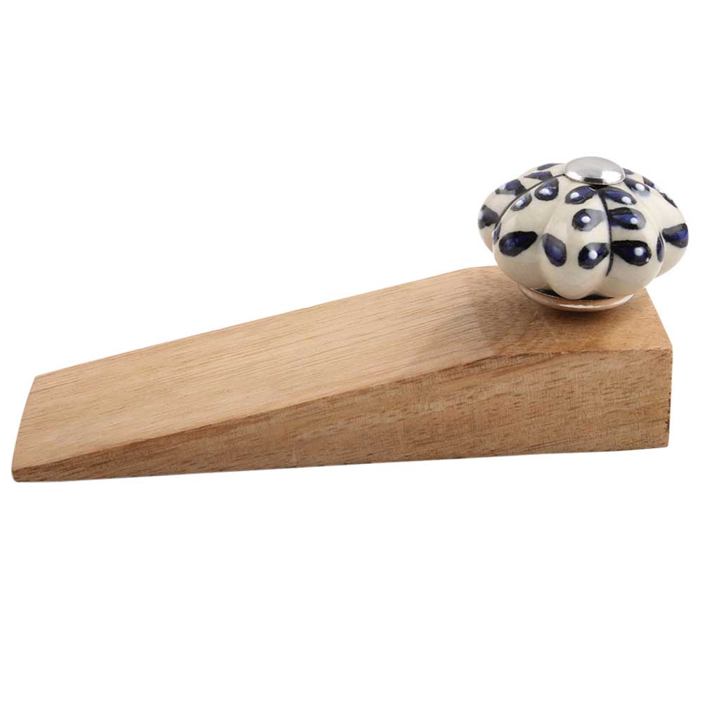 Indianshelf.com for bulk/wholesale orders.Indianshelf.us for personal purchases.The Navy Blue Leaf Melon Ceramic Wooden Door Stopper is a beautifully crafted addition to any home. With its combination of ceramic and wood materials, it provides both aesthetic appeal and practical functionality. Featuring a navy blue leaf melon design, this door stopper adds a touch of nature-inspired elegance to your space while effectively keeping your doors open or preventing them from slamming shut.