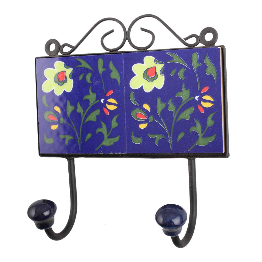 Navy Blue Light Green Floral Tiles Hook. When Put on Wall or Cabinet It is An Art in Itself. the Metal Part of This Hook is Black Powder Coated.