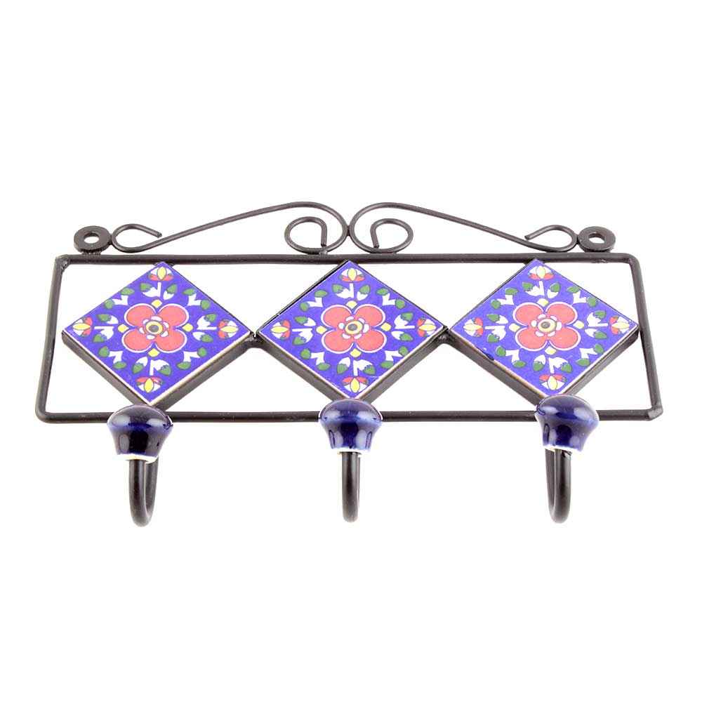 Navy Blue Red Floral Tiles Hooks. When Put on Wall or Cabinet it is an Art in itself. The Metal Part of this Hook is Black Powder Coated.