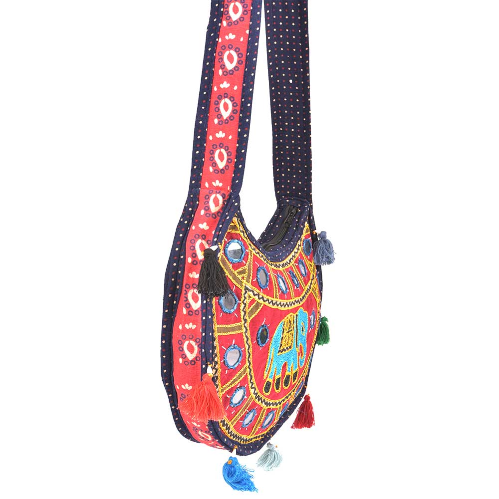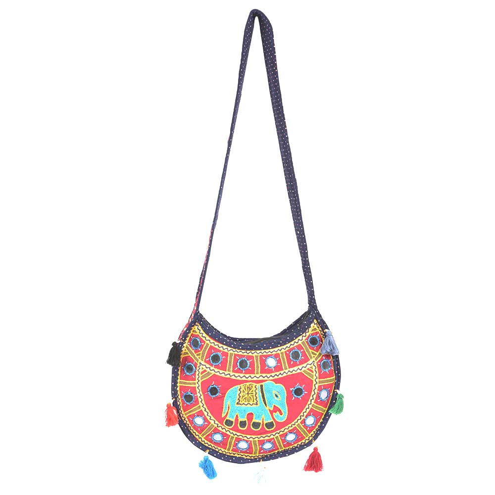 Navy Blue Red Semi Circle Elephant Embroidered Sling Bag