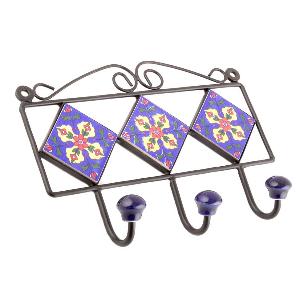 Navy Blue Red Tiny Flower Tiles Hooks. When Put on Wall or Cabinet it is an Art in itself. The Metal Part of this Hook is Black Powder Coated.