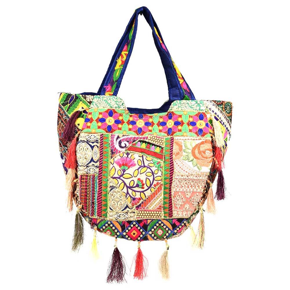 Vintage tribal kutchi banjara bag boho Indian gypsy hand embroidered mirror work multi color bag with tassels vintage coins beads .
