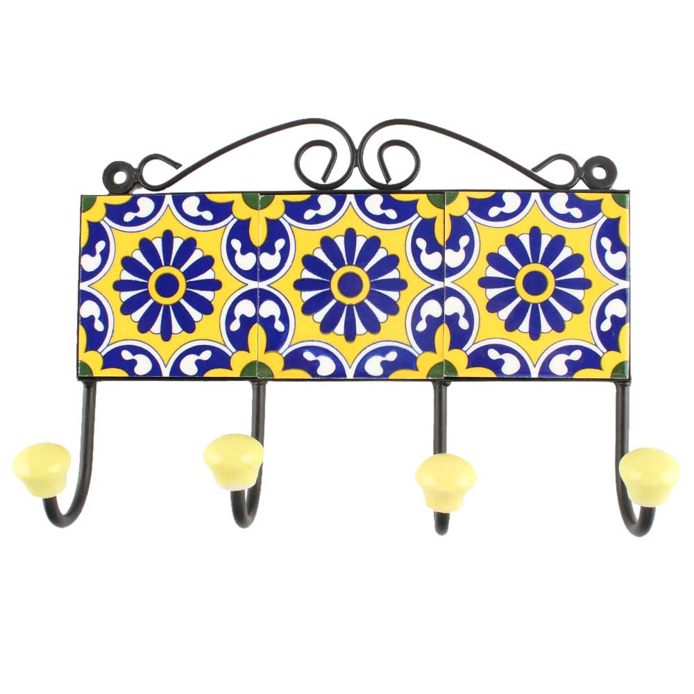 Navy Blue Wheel Flower Ceramic Tile Hook. When Put on Wall or Cabinet It is An Art in Itself. The Metal Part of this Hook is Black Powder Coated.