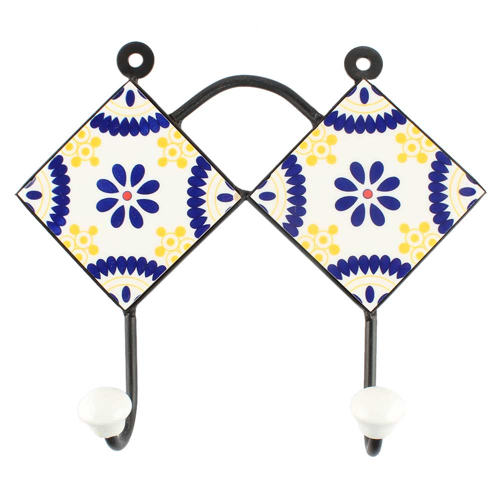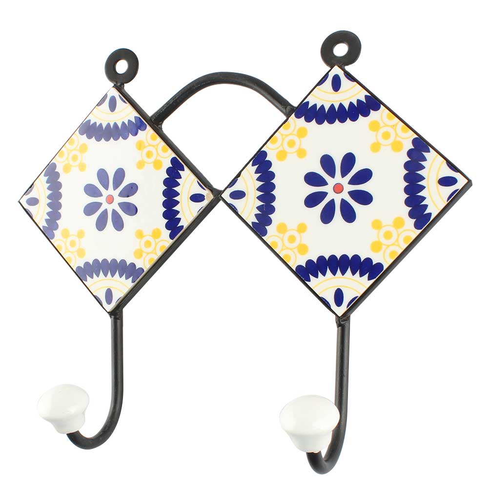 Navy Blue Wheel Flower Ceramic Tile Hook. When Put on Wall or Cabinet It is An Art in Itself. The Metal Part of this Hook is Black Powder Coated.