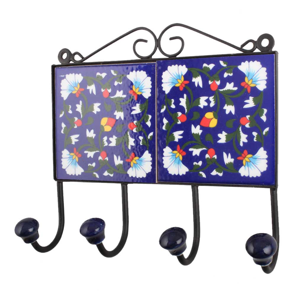 Navy Blue White Floral Tiles Hook. When Put on Wall or Cabinet It is An Art in Itself. the Metal Part of This Hook is Black Powder Coated.