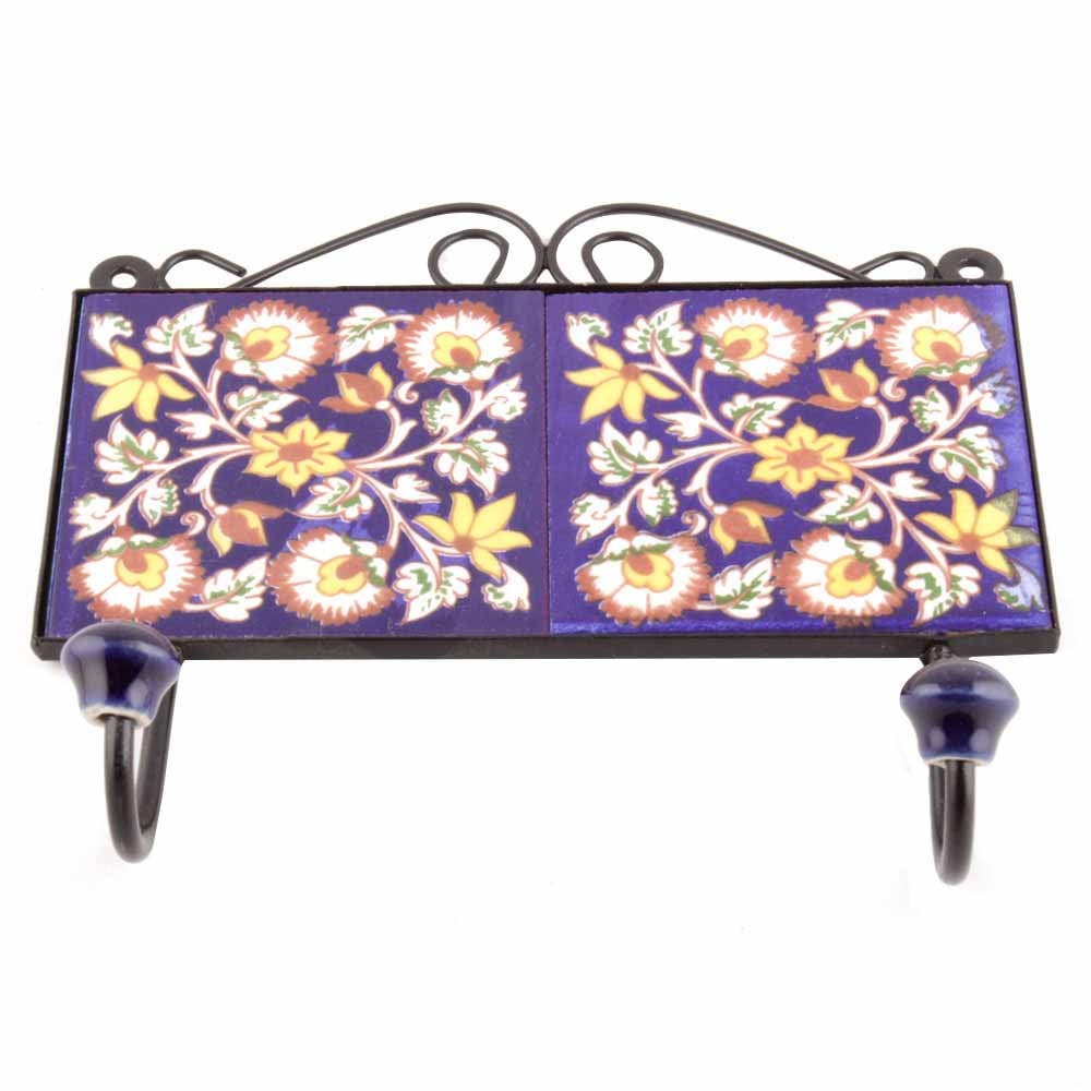 Navy Blue White Floral Tiles Hooks. When Put on Wall or Cabinet it is an Art in itself. The Metal Part of this Hook is Black Powder Coated.