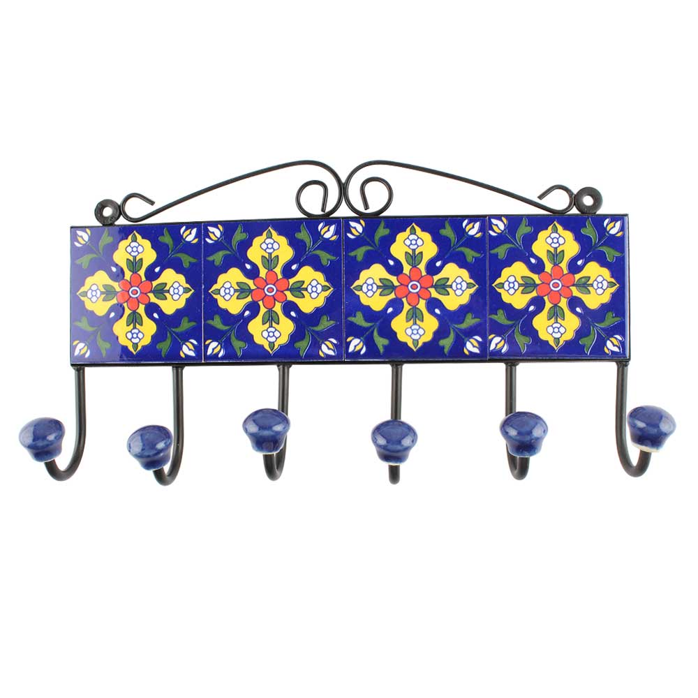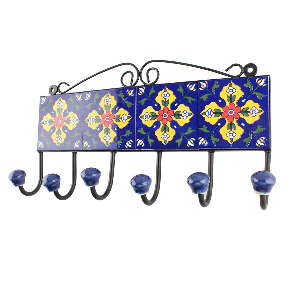 Navy Blue With Yellow Leaf Ceramic Floral Tiles Hook. When Put on Wall or Cabinet It is An Art in Itself. The Metal Part of this Hook is Black Powder Coated.