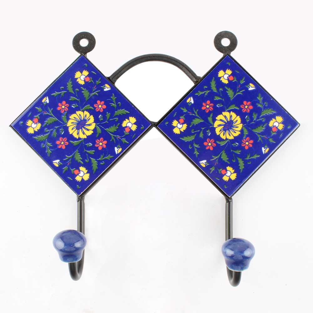 Navy Blue With Yellow Wheel Flower Ceramic Tiles Hooks. When Put on Wall or Cabinet It is An Art in Itself. The Metal Part of this Hook is Black Powder Coated.