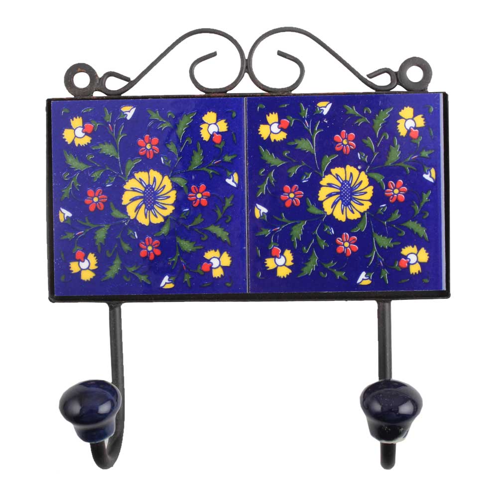 Navy Blue Yellow Floral Tiles Hook. When Put on Wall or Cabinet It is An Art in Itself. the Metal Part of This Hook is Black Powder Coated.