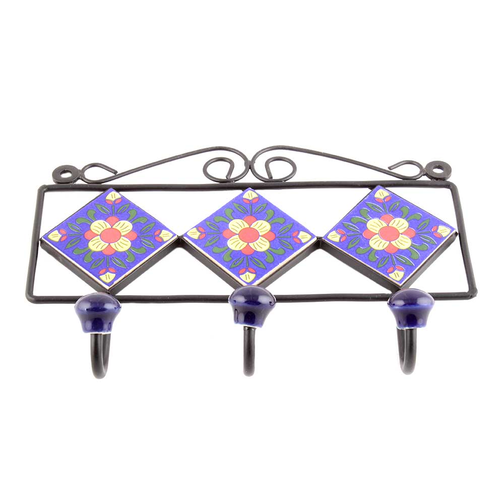 Navy Blue Yellow Floral Tiles Hooks. When Put on Wall or Cabinet it is an Art in itself. The Metal Part of this Hook is Black Powder Coated.