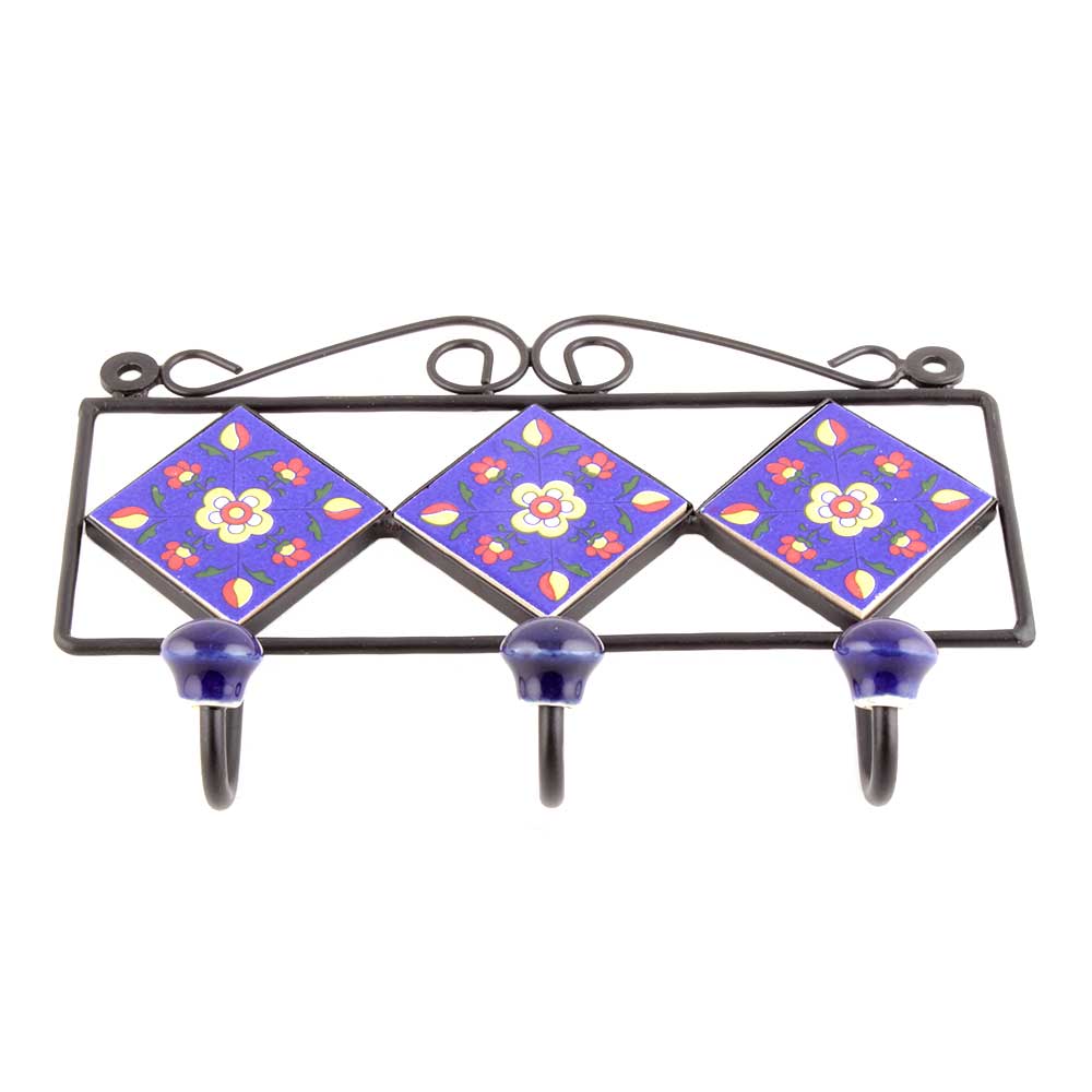 Navy Blue Yellow Floral Tiles Hooks. When Put on Wall or Cabinet it is an Art in itself. The Metal Part of this Hook is Black Powder Coated.