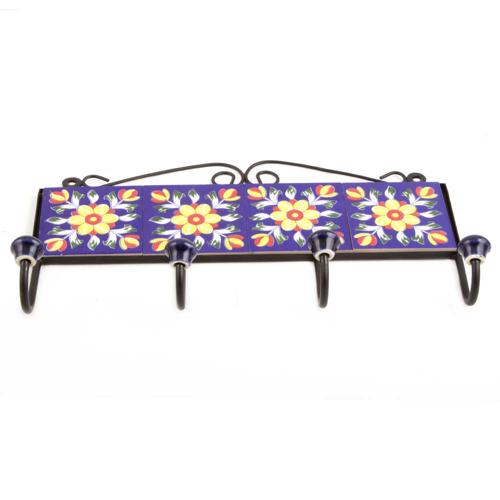 Navy Blue Yellow Flower Tiles Hooks .When put on wall or cabinet it is an art in itself. The metal part of this hook is black powder coated.