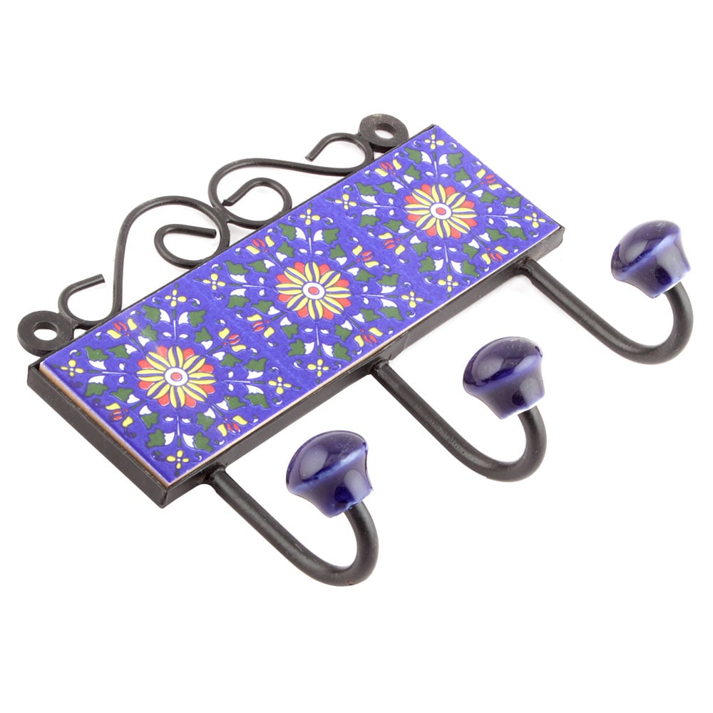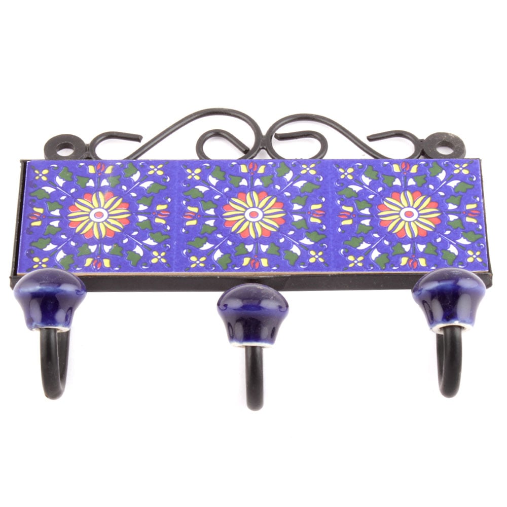 Navy Blue Yellow Sun Flower Tiles Hooks. When Put on Wall or Cabinet it is an Art in itself. The Metal Part of this Hook is Black Powder Coated.