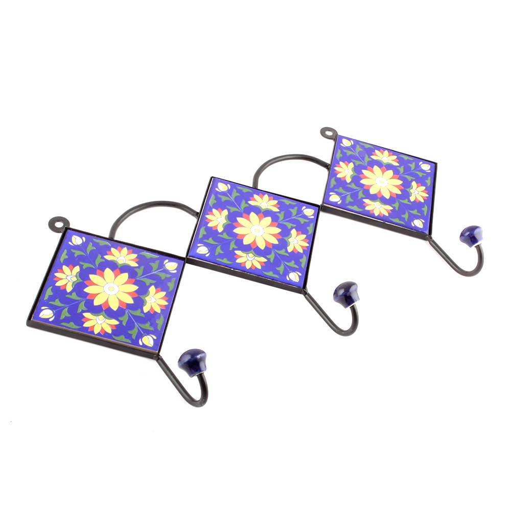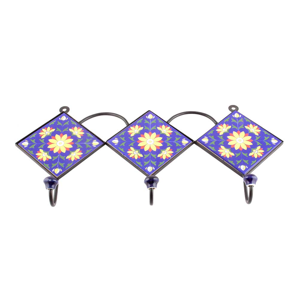 Navy Blue Yellow Sunflower Ceramic Tiles Hooks. When Put on Wall or Cabinet it is an Art in itself. The Metal Part of this Hook is Black Powder Coated.