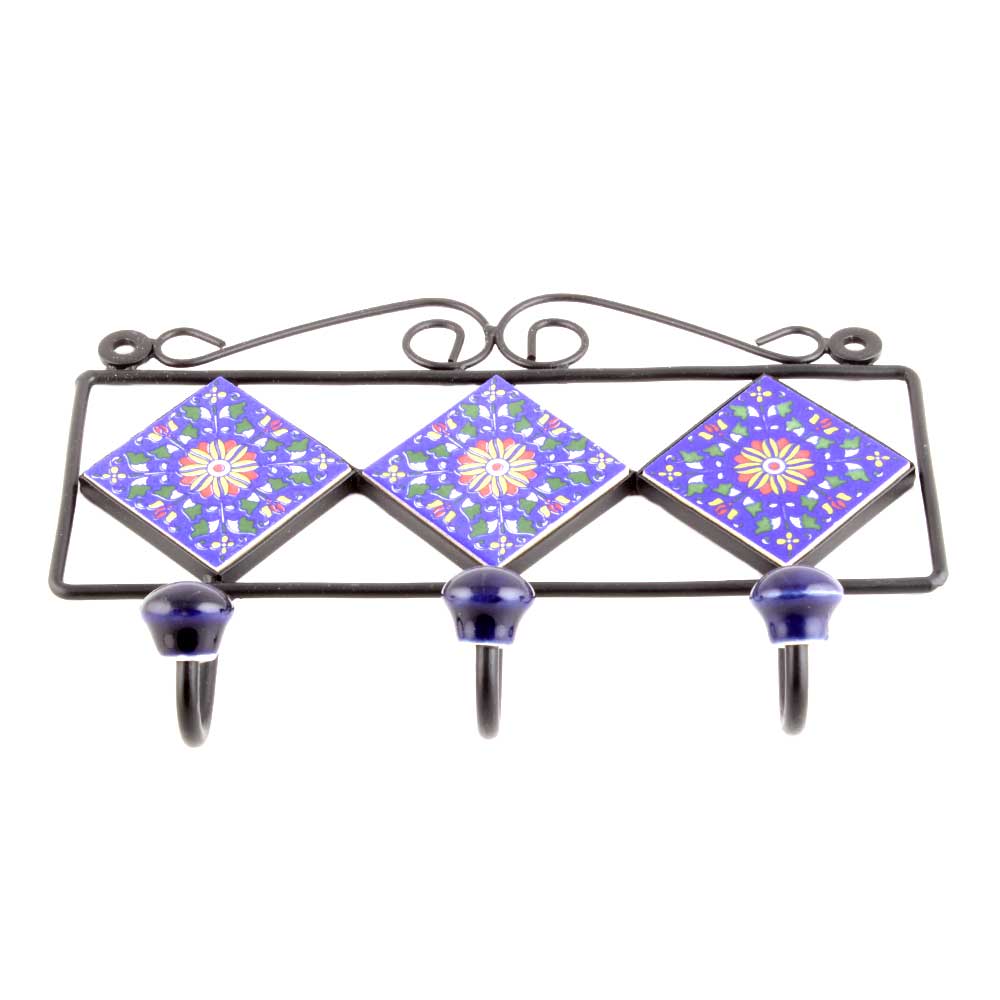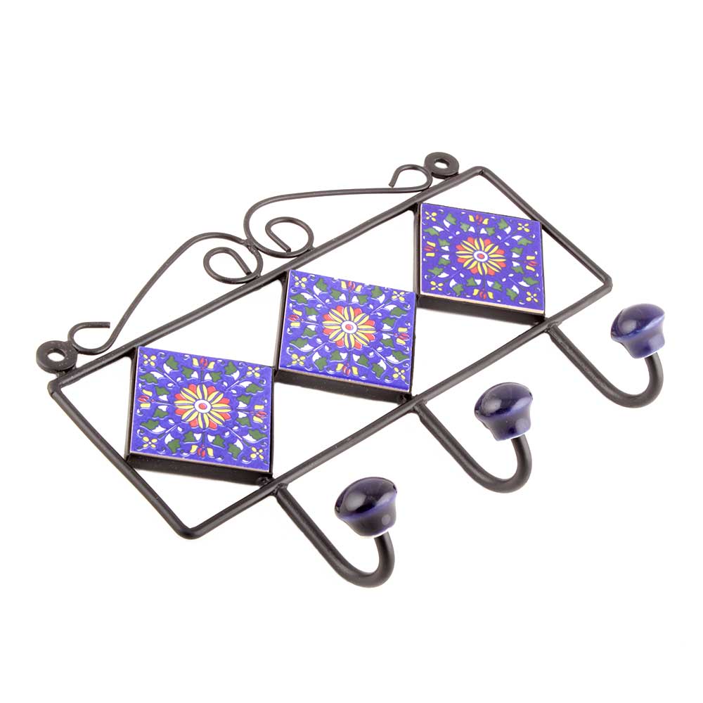 Navy Blue Yellow Sunflower Flower Tiles Hook. When Put on Wall or Cabinet it is an Art in itself. The Metal Part of this Hook is Black Powder Coated.
