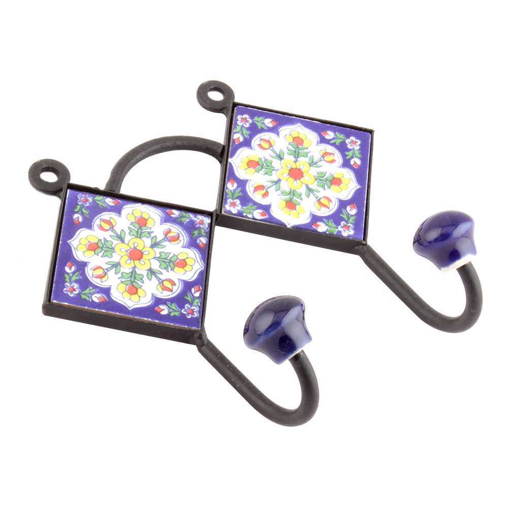 Navy Blue Yellow Tinny Flower Tiles Hooks. When Put on Wall or Cabinet it is an Art in itself. The Metal Part of this Hook is Black Powder Coated.