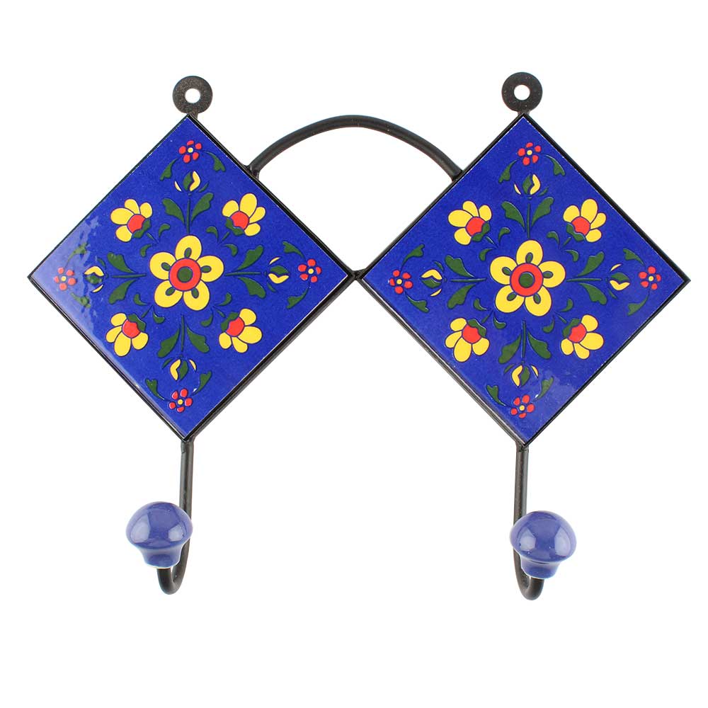 Navy Blue Yellow Tiny Flower Ceramic Tiles Hook. When Put on Wall or Cabinet It is An Art in Itself. The Metal Part of this Hook is Black Powder Coated.