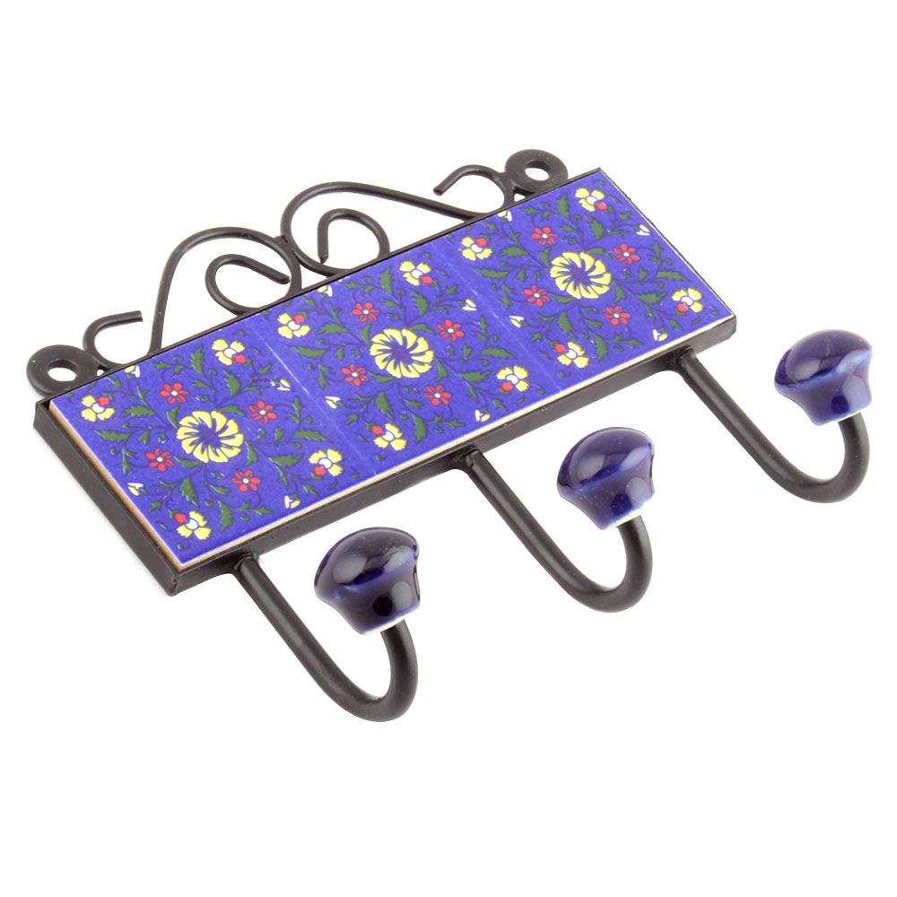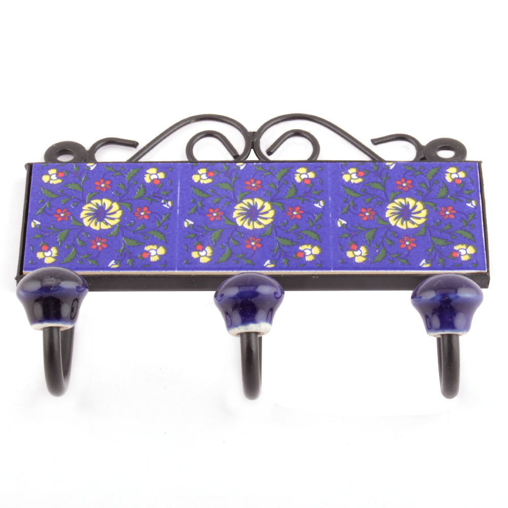 Navy Blue Yellow Wheel Floral Tiles Hooks. When Put on Wall or Cabinet it is an Art in itself. The Metal Part of this Hook is Black Powder Coated.
