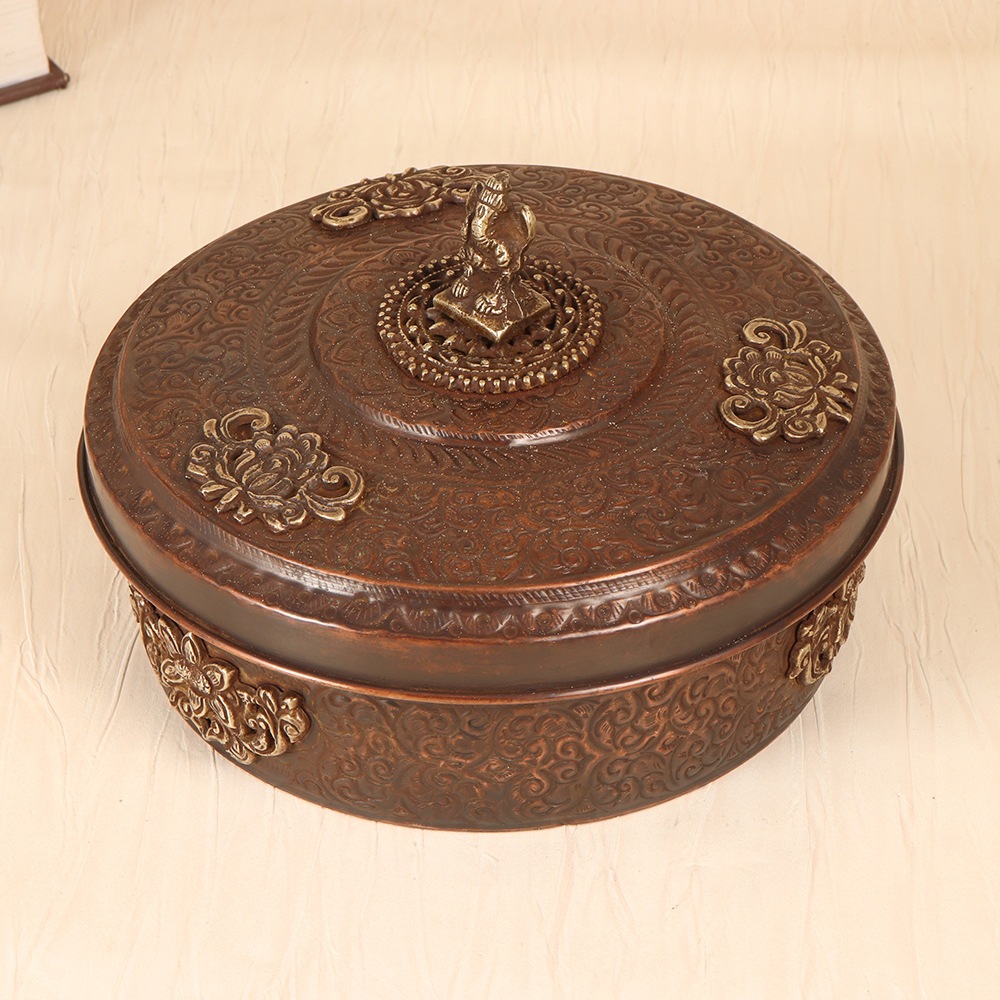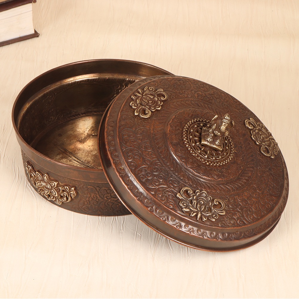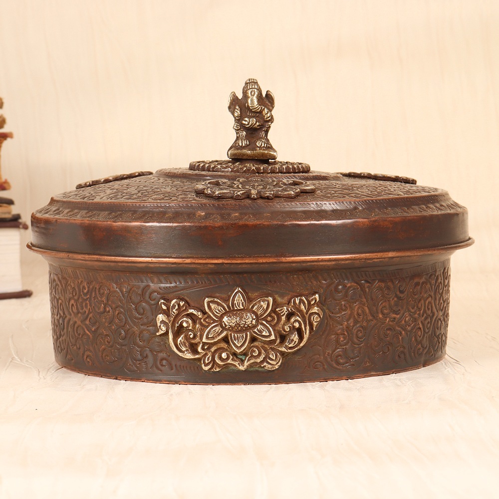 Elevate your home decor with the captivating Vintage Copper Metal Box - a stunning piece of Nepalese craftsmanship that exudes timeless elegance. This exquisite copper box is more than just a storage solution - it's a work of art that celebrates the rich heritage of Nepalese artistry. The intricate engraving and the iconic Lord Ganesha carving on the lid make this piece a captivating focal point, elevating the ambiance of any room. Crafted with meticulous attention to detail, the sturdy copper construction ensures long-lasting durability, while the natural patina lends an air of vintage sophistication. Whether you're looking to organize your personal treasures or simply desire a stunning decorative accent, the Vintage Copper Metal Box is the perfect choice. Its timeless beauty and functional versatility make it a must-have for discerning homeowners, collectors, and culture enthusiasts alike. Bring a touch of Nepalese artistry into your life and let this exquisite copper box become the centerpiece of your cherished possessions.
