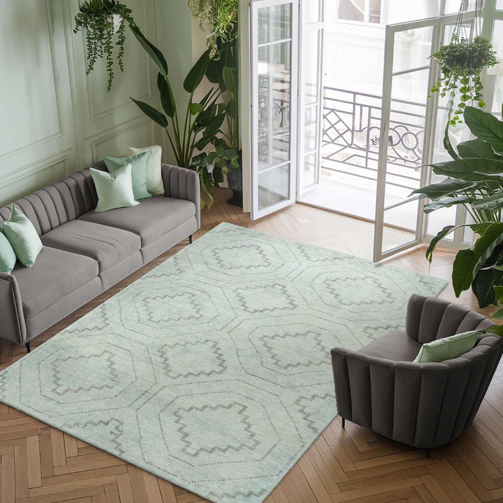 The rug combines geometric symmetry with a soft neutral palette, making it versatile for both modern and traditional décor.