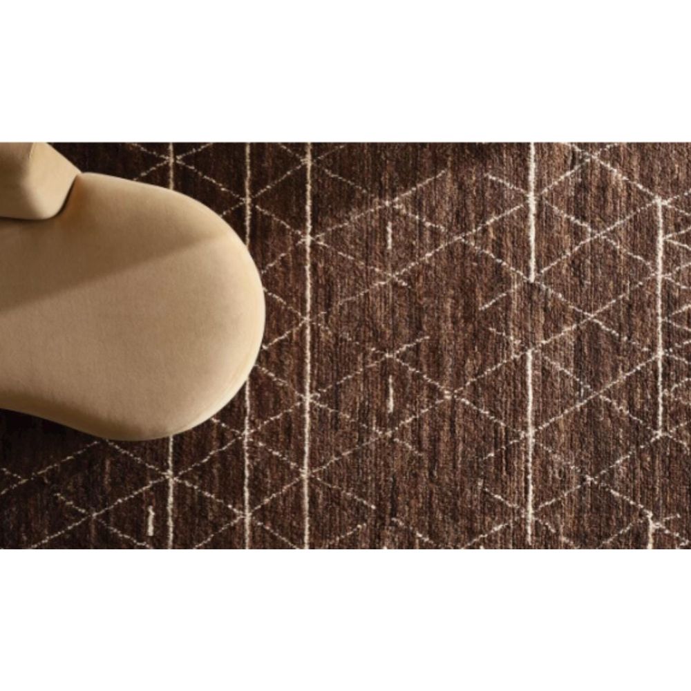 The rug features an authentic charcoal-brown tone with ivory detailing, slightly varied due to natural handmade finishing.