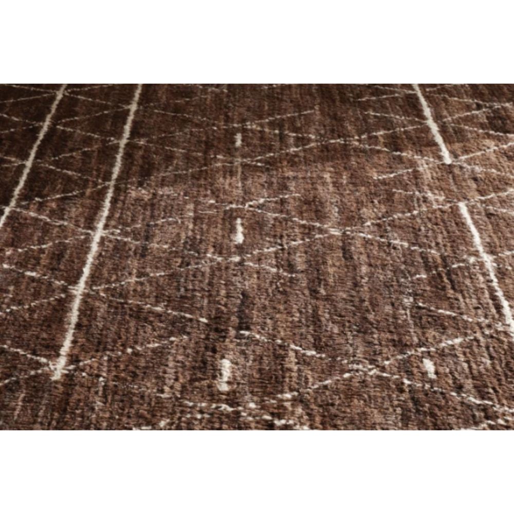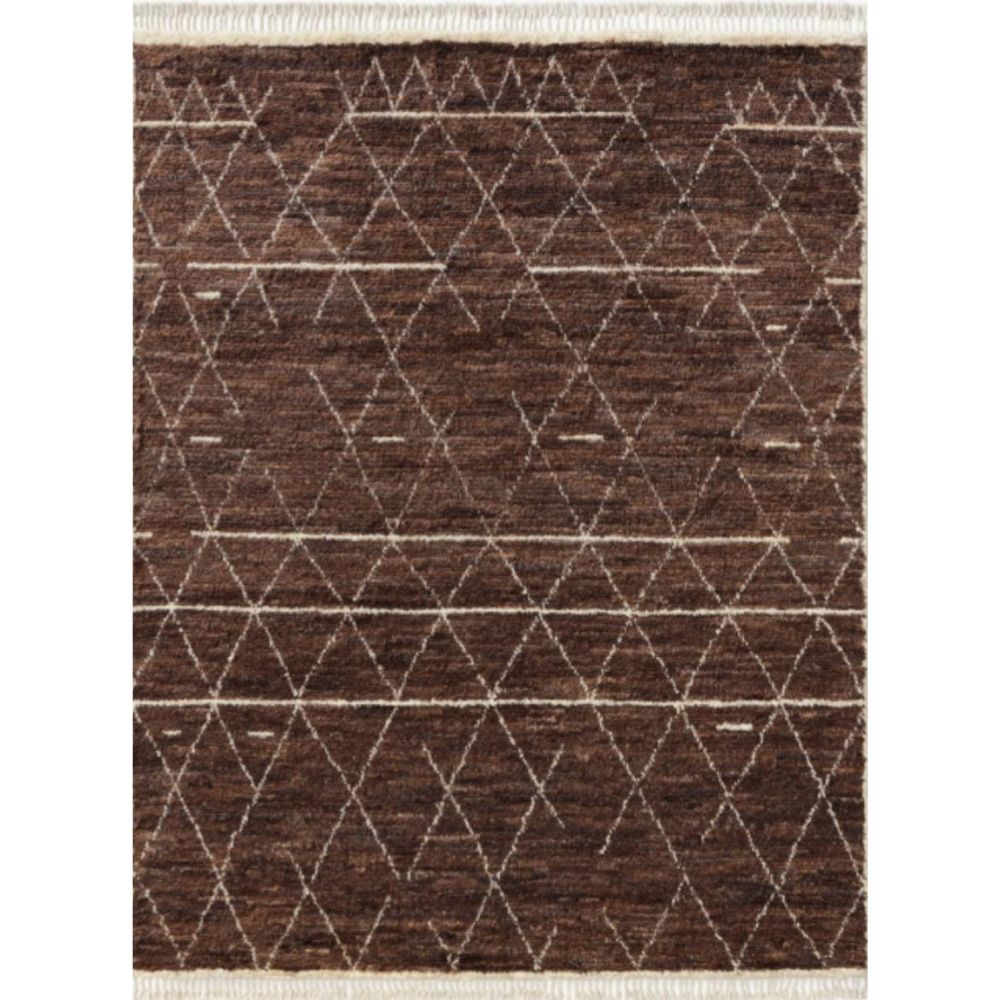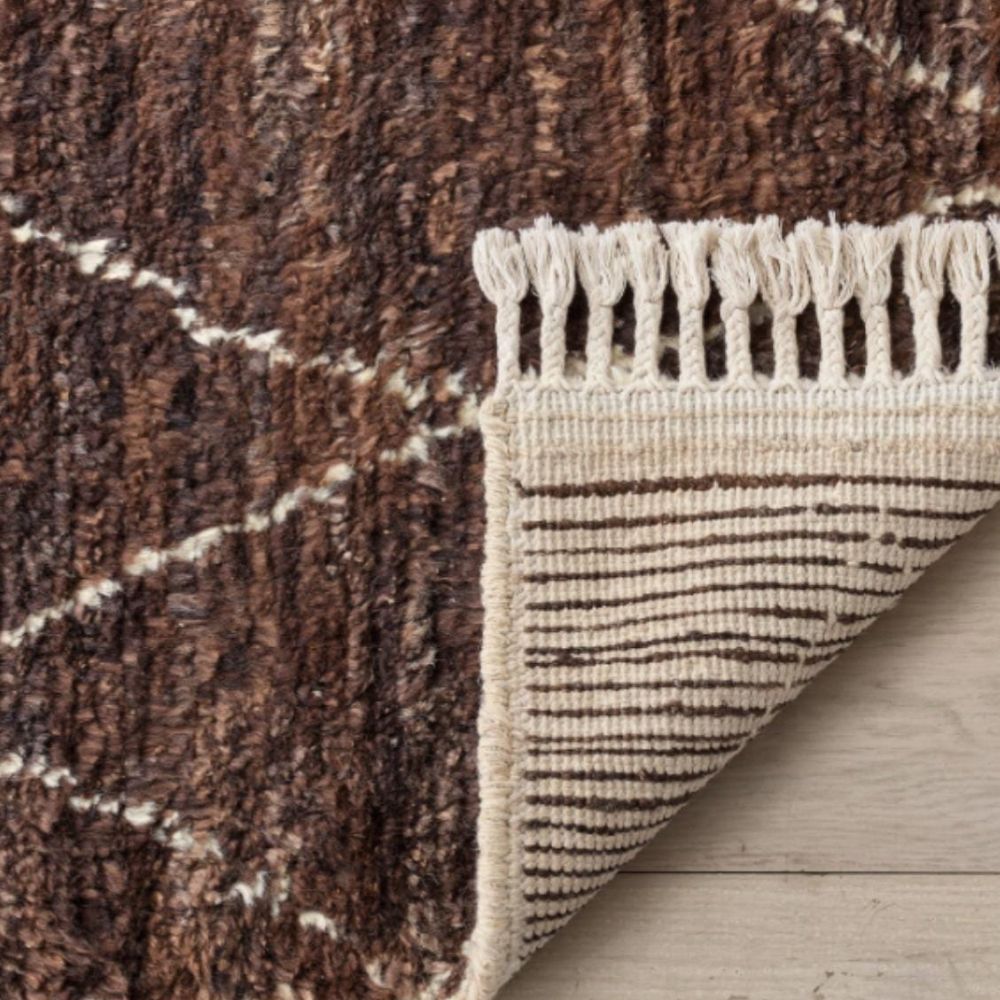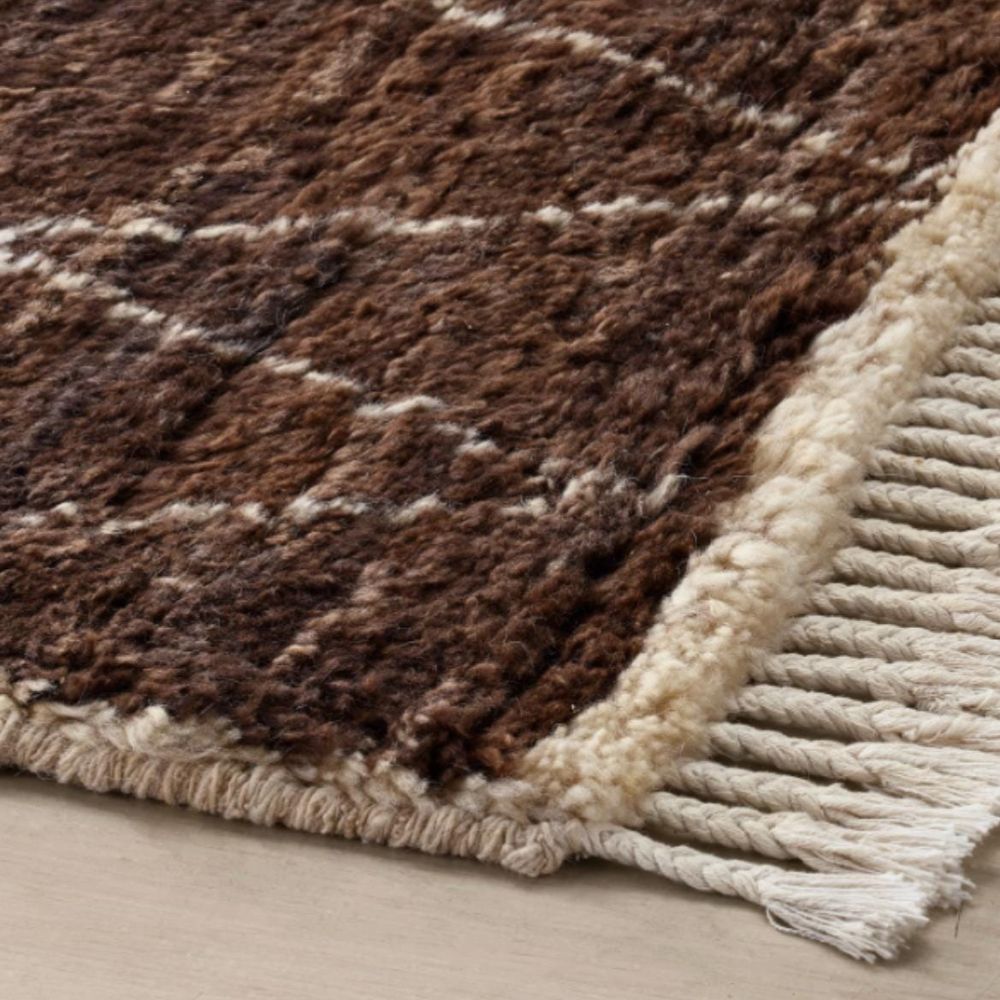 The rug features an authentic charcoal-brown tone with ivory detailing, slightly varied due to natural handmade finishing.