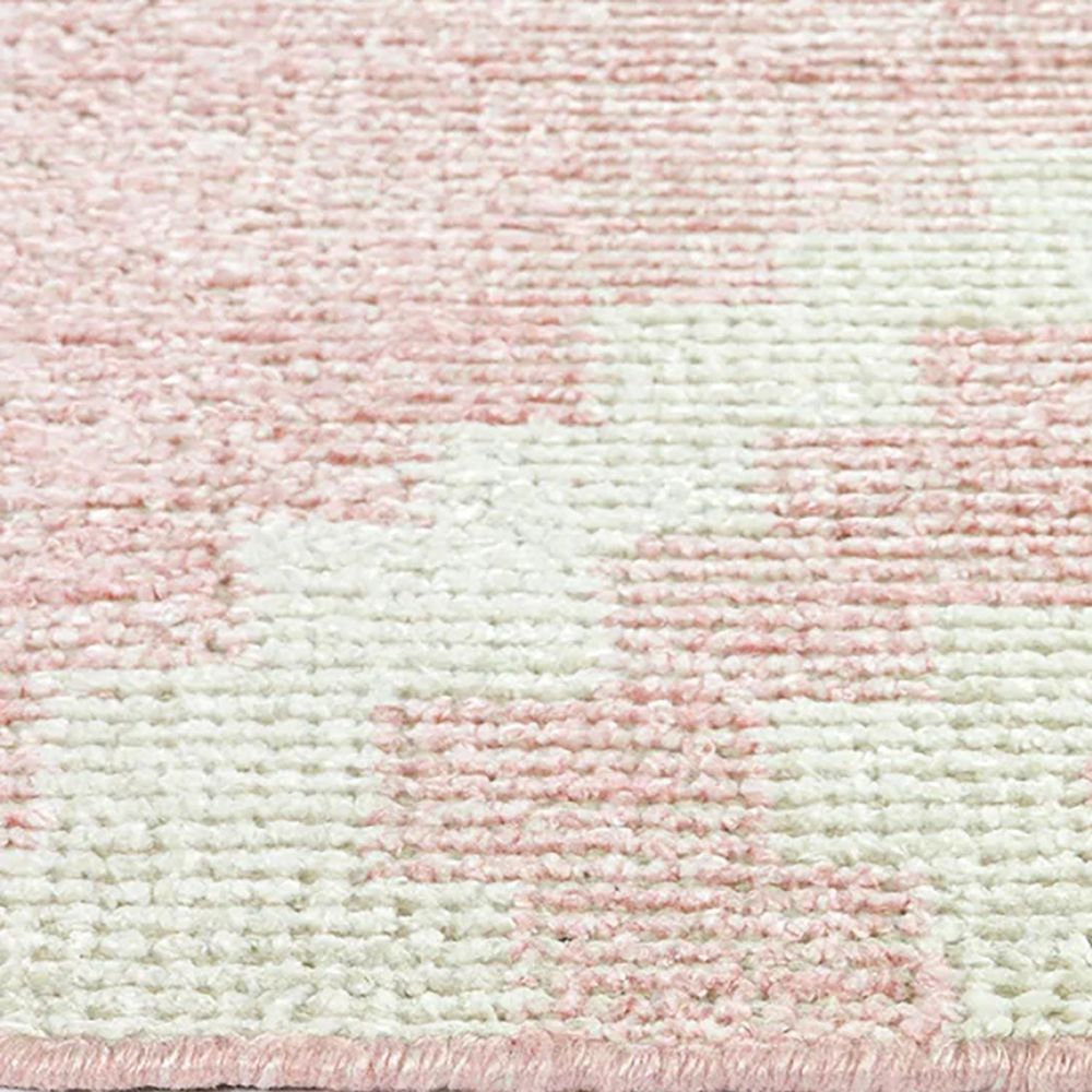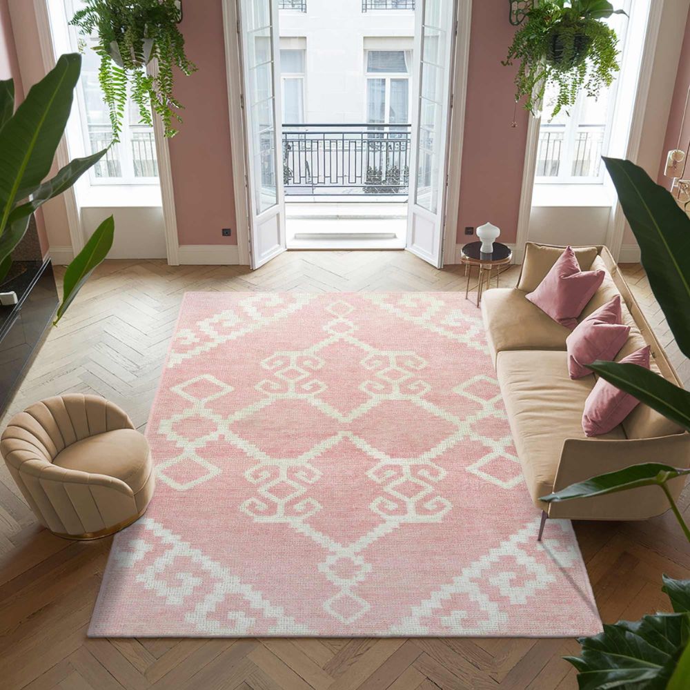 - Pastel pink rug with ivory white geometric designs