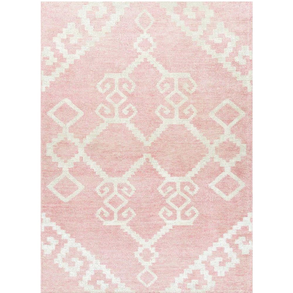 The geometric tribal-inspired pattern adds structure to the delicate pink tone, making it versatile for bedrooms, nurseries, and living spaces.