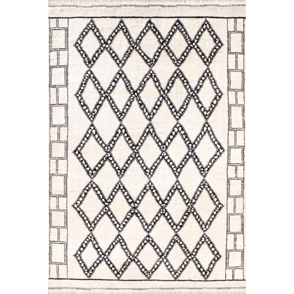 Elevate your space with the Moroccan Design Handmade White Rug, featuring an ivory base highlighted with striking black diamond lattice patterns framed by bold square motifs. Crafted from a premium cotton and wool blend, this rug blends softness with durability, making it ideal for modern and eclectic interiors.