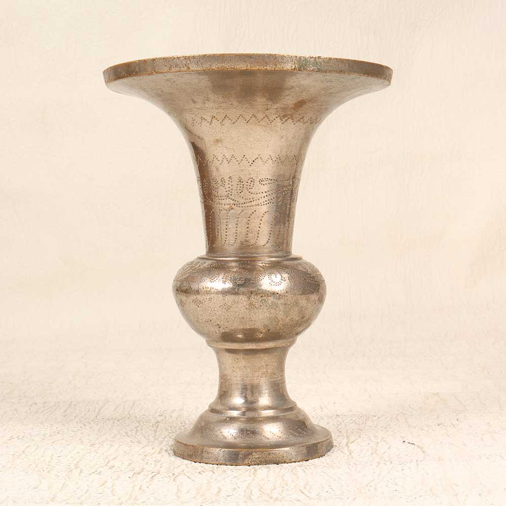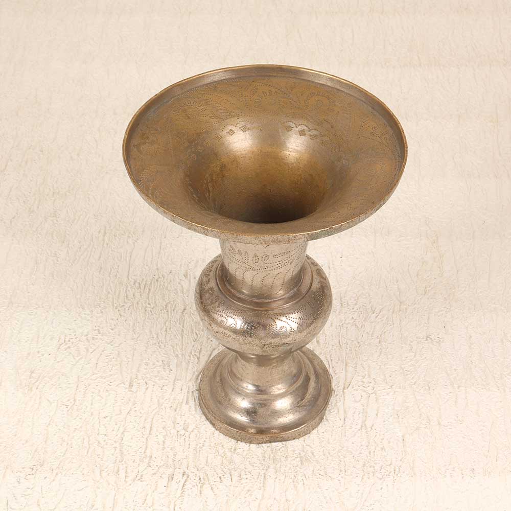 Make your home blossom with our vintage brass flower pot. This stunning planter features an intricate hand-engraved floral pattern that will add an elegant touch to any space. The durable nickel-plated brass construction ensures it will maintain its luster for years to come. With its vintage styling and engraved detailing, this brass flower pot is ideal for creating a romantic, timeless look in your home or garden. The generous 8 inch diameter opening gives plenty of room for a small bush or several smaller plants. Place it on your patio, windowsill, or anywhere you want to infuse a bit of old-world charm. For anyone looking to add a touch of sophistication to their home decor, this engraved brass flower pot is sure to impress. The vintage styling is versatile enough to complement any aesthetic, from modern farmhouse to traditional and everything in between. Give your plants the graceful display they deserve with this unique and eye-catching planter.