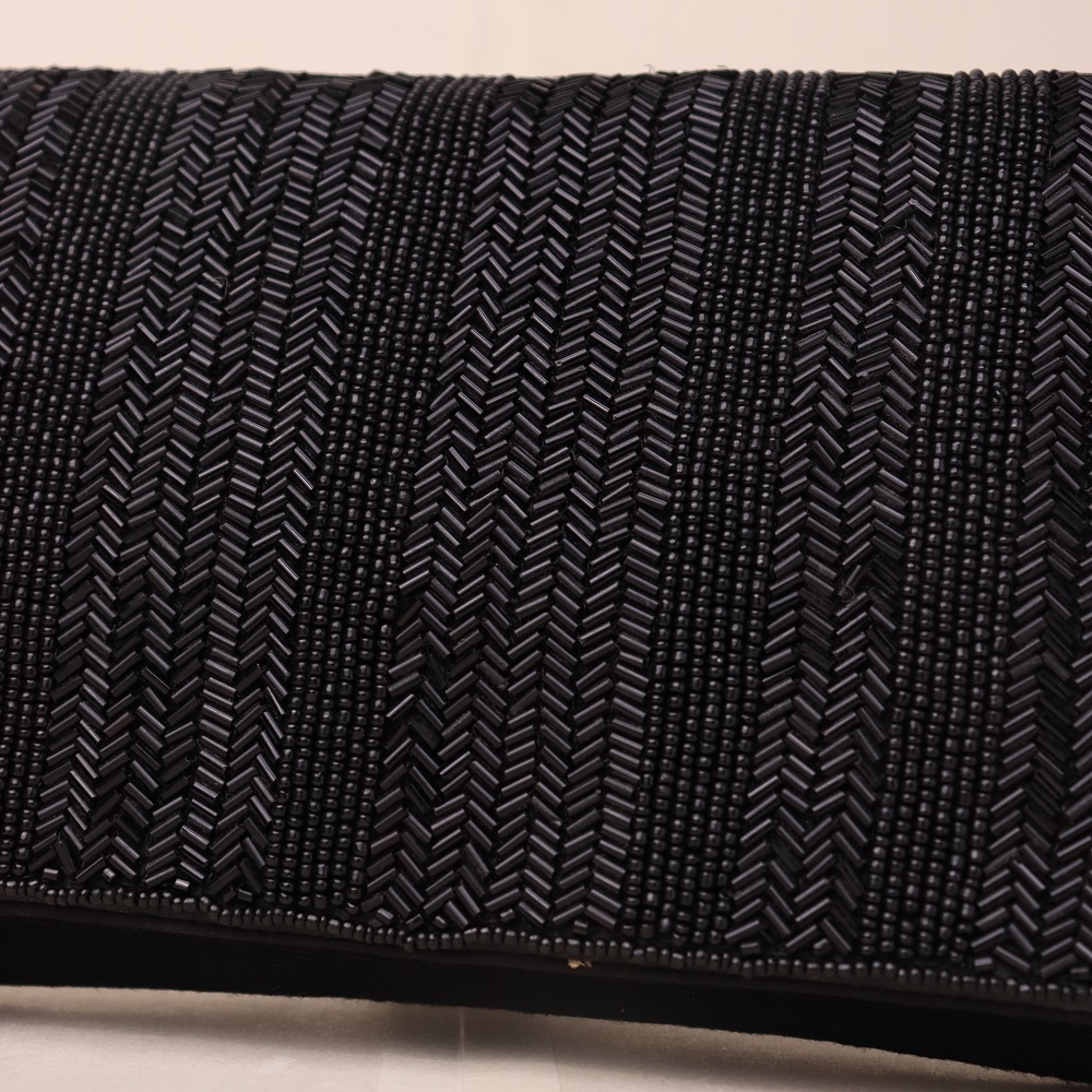 Sleek, subtle, and sophisticated—this handcrafted clutch showcases a refined chevron beadwork pattern that radiates understated luxury. Its monochrome finish and structured silhouette make it an essential accessory for formal evenings or minimal glam looks. Complete with a detachable chain strap, this piece offers versatile styling options, whether worn over the shoulder or carried as a statement clutch.