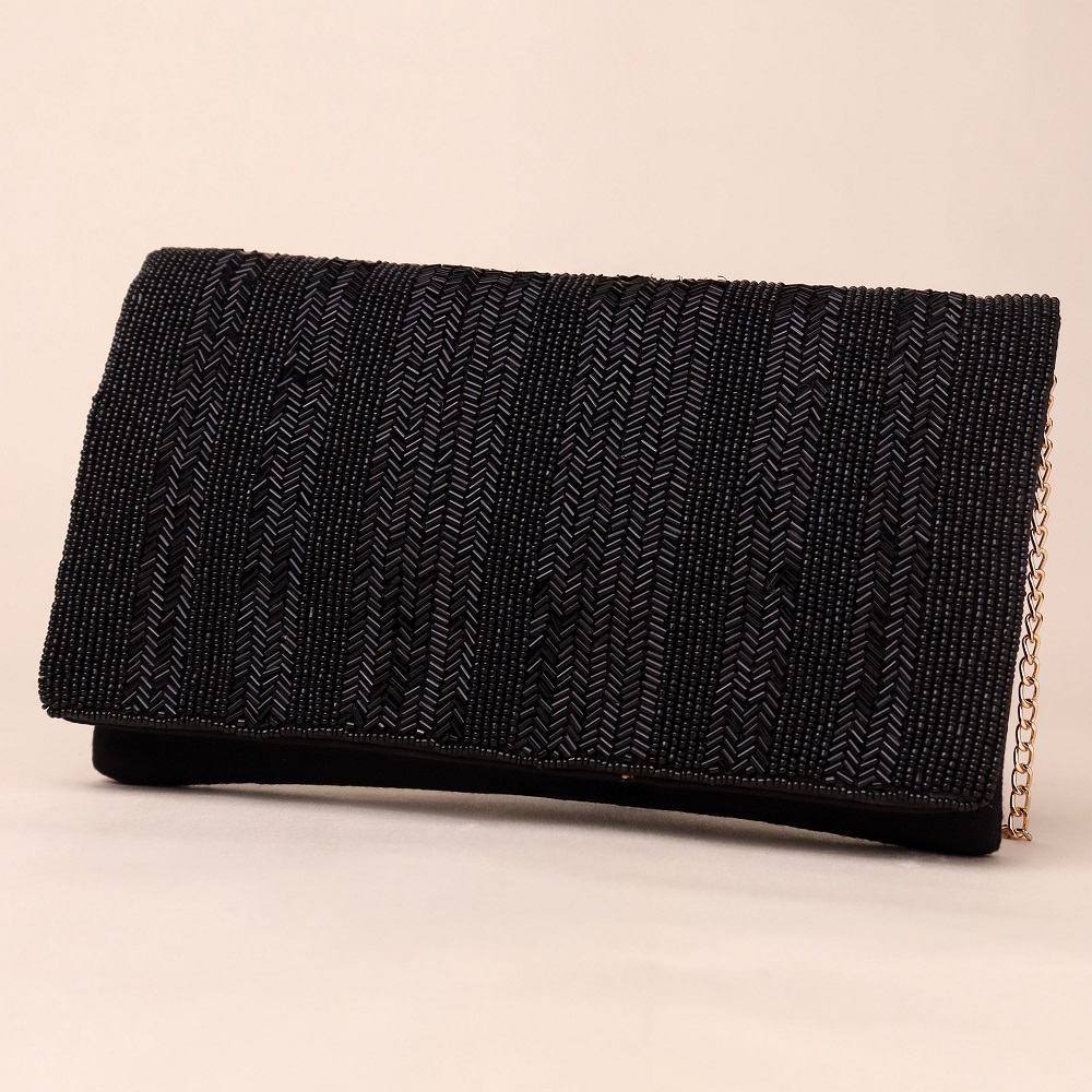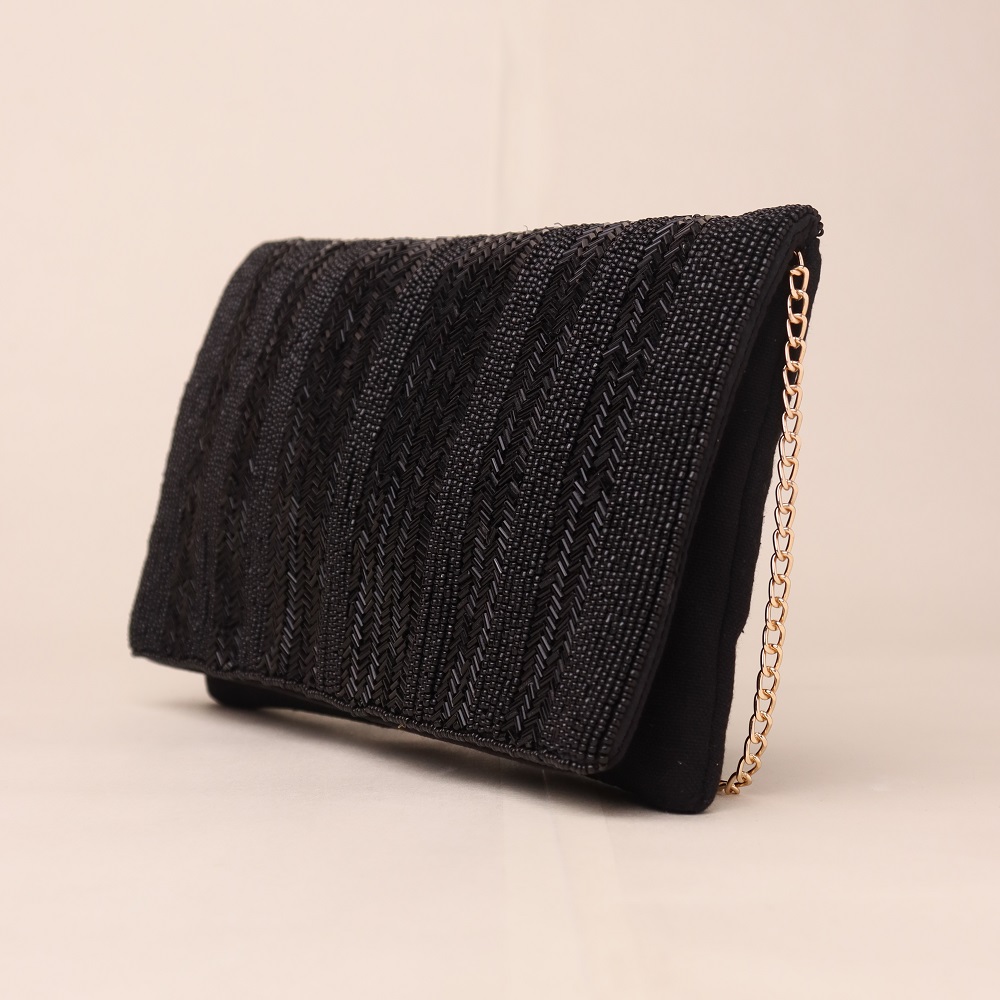Noir Elegance Chevron Beaded Clutch with Chain Strap