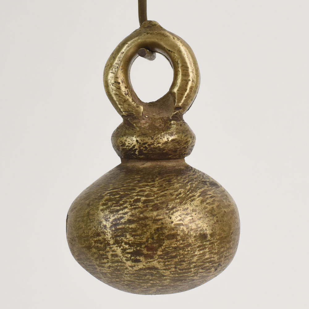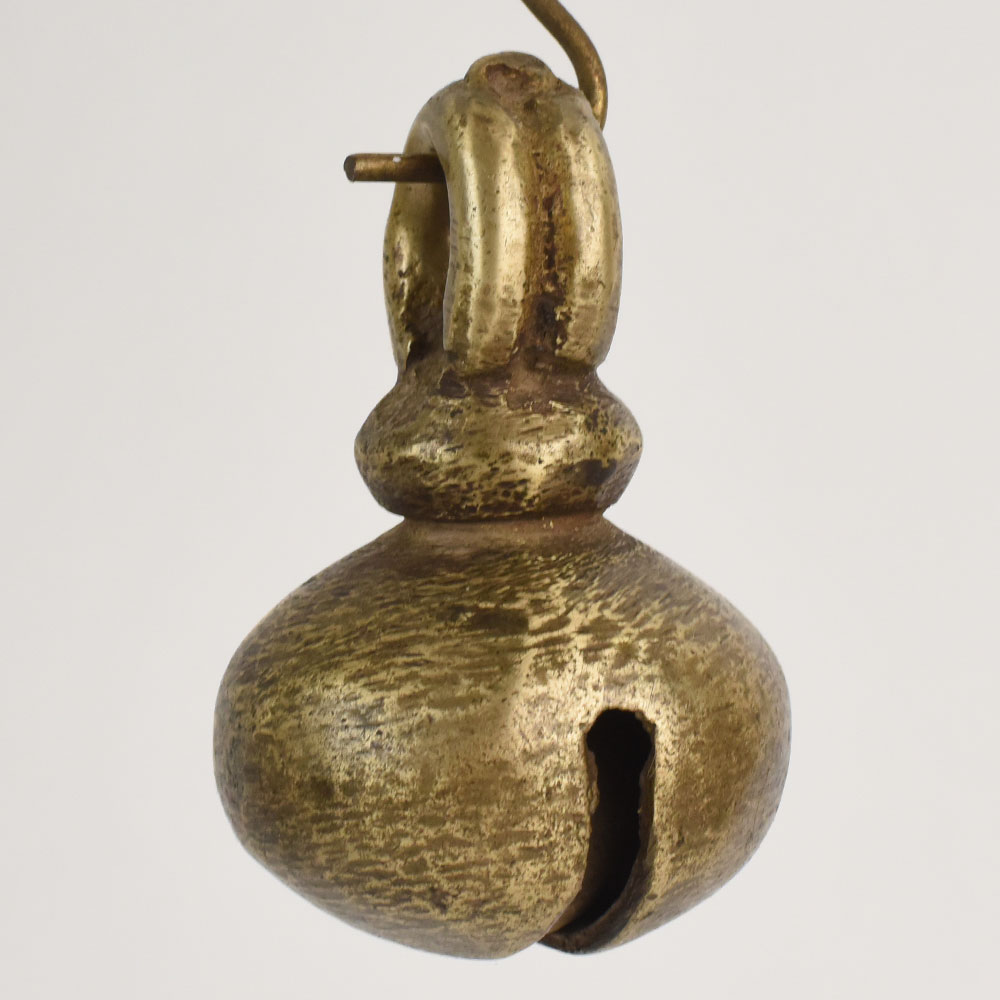 This antique bell metal cow bell from Northern India brings unmistakable rustic beauty and cultural richness to any space. Hand-forged by skilled artisans, it features a robust rounded shape and smooth looped top traditionally used for fastening to livestock. Its beautifully aged finish tells a storydeep bronze hues, speckled dark markings, and natural patina developed over decades. Perfect for farmhouse, boho, or vintage-inspired interiors, this piece adds warmth and authenticity. The bells textured surface and handcrafted imperfections make it an ideal collectable for those who appreciate historical craftsmanship. Whether hung on a wall or displayed as part of a curated arrangement, it enhances interiors with old-world charm and artistic character.