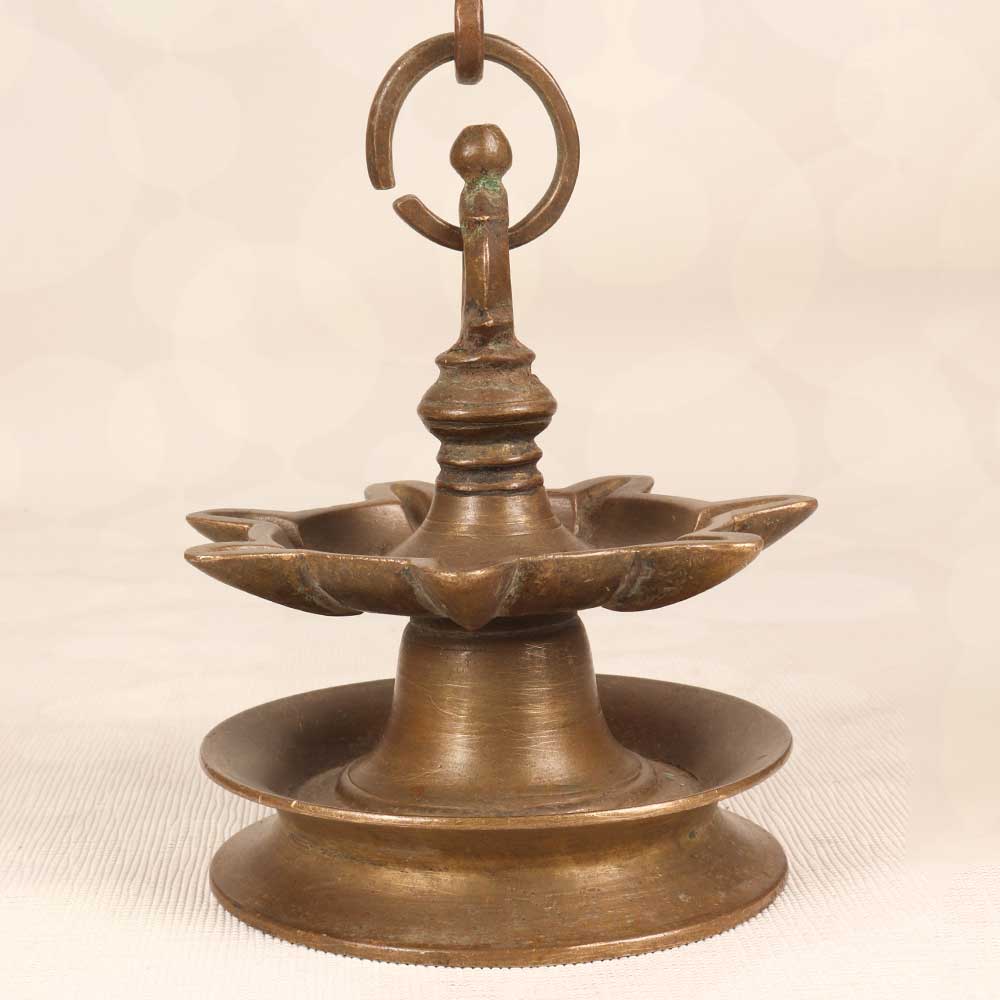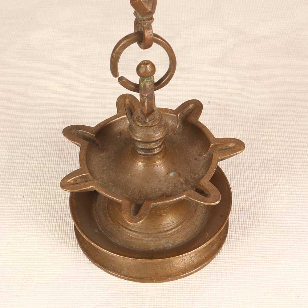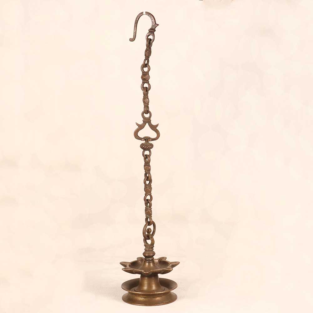 Illuminate your home with the warm, inviting glow of the past. This beautiful brass hanging oil lamp brings old-world charm to any space. Featuring an intricate, handcrafted brass design with 7 jyots for multiple flames, this lamp harkens back to a simpler time before electricity. Step back in time as you light each wick and watch the flames dance, casting a soft, ambient glow over the room. The light plays off the polished brass curves, creating enchanting shadows on the walls. Place it in your living room, bedroom, or entryway to complement your decor. For anyone seeking elegance and nostalgia, this brass hanging oil lamp evokes the romance of India's rich cultural heritage. Let it be a cherished focal point that sparks conversation and admiring glances from guests. Its timeless beauty will only grow more distinguished with age.